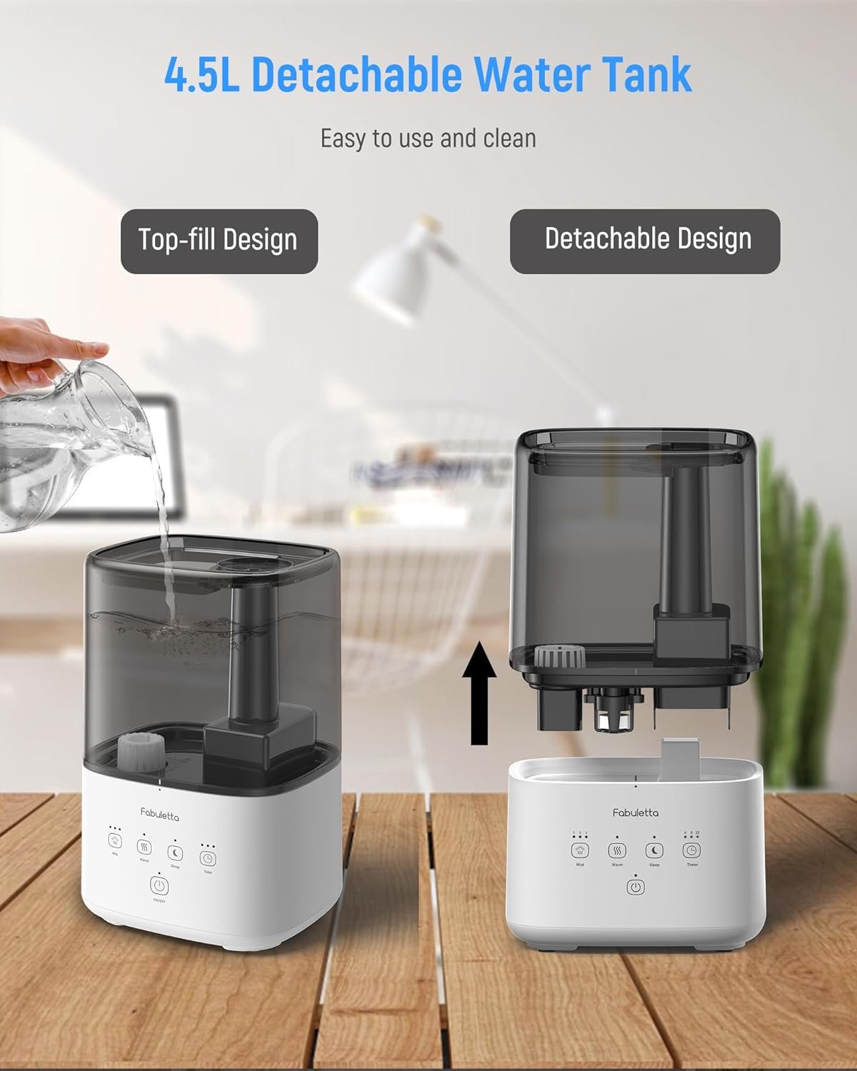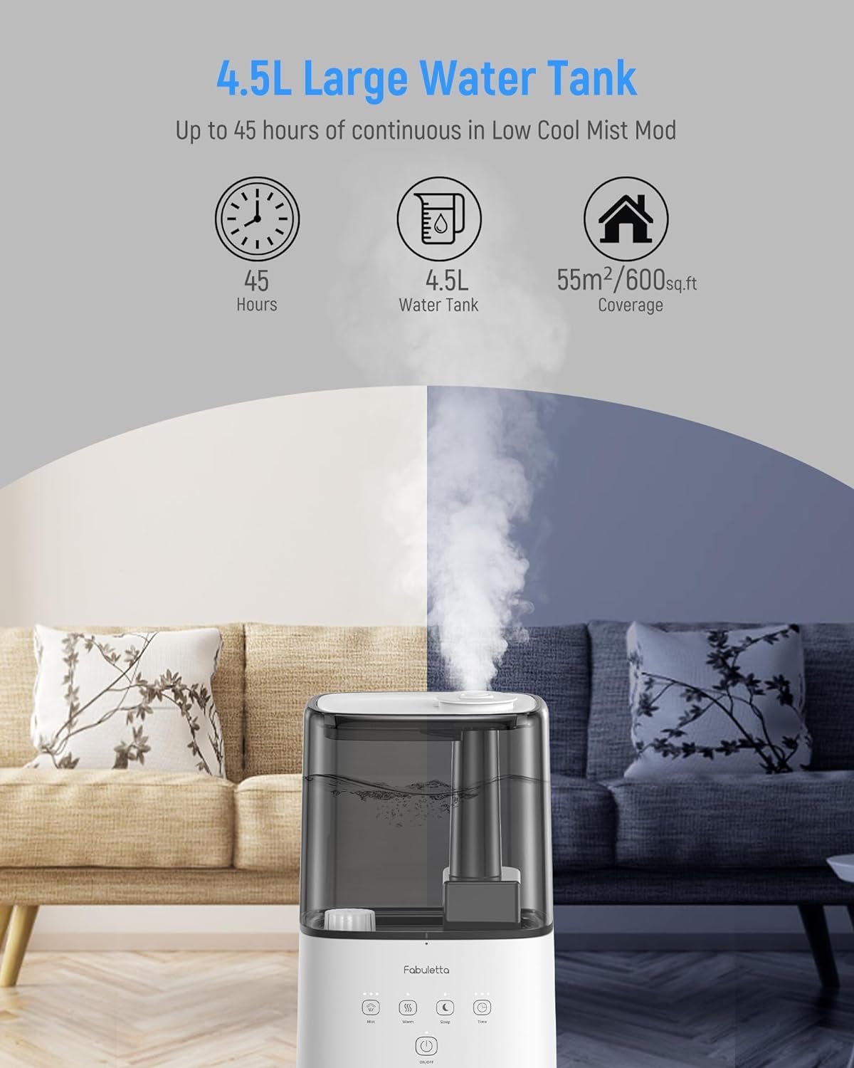 【Detachable Top-fill 4.5L Water Tank】: The humidifier for home large rooms boasts an extra-large 4.5L water tank, effectively covering up to 53m²/580 sq.ft. With a single fill, enjoy up to 45 hours of continuous operation. The FABULETTA bedroom humidifier features a user-friendly top-fill design and a detachable water tank, making water refills and deep cleaning a breeze.