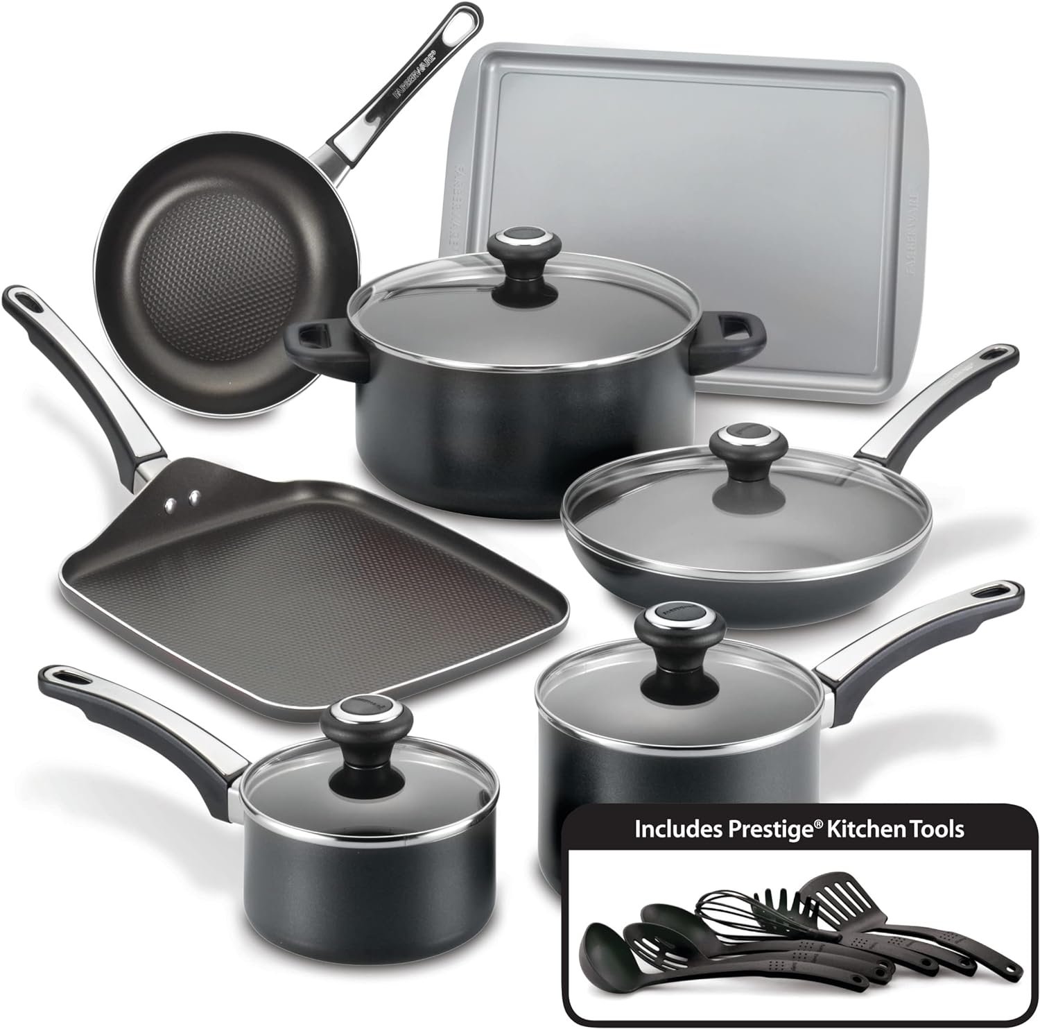Set includes: 1 and 2 quart saucepans with lids, 5 quart dutch oven with lid, 8 inch frying pan, 10 inch frying pan with lid, 11 inch square griddle, medium cookie pan, 6 kitchen utensils