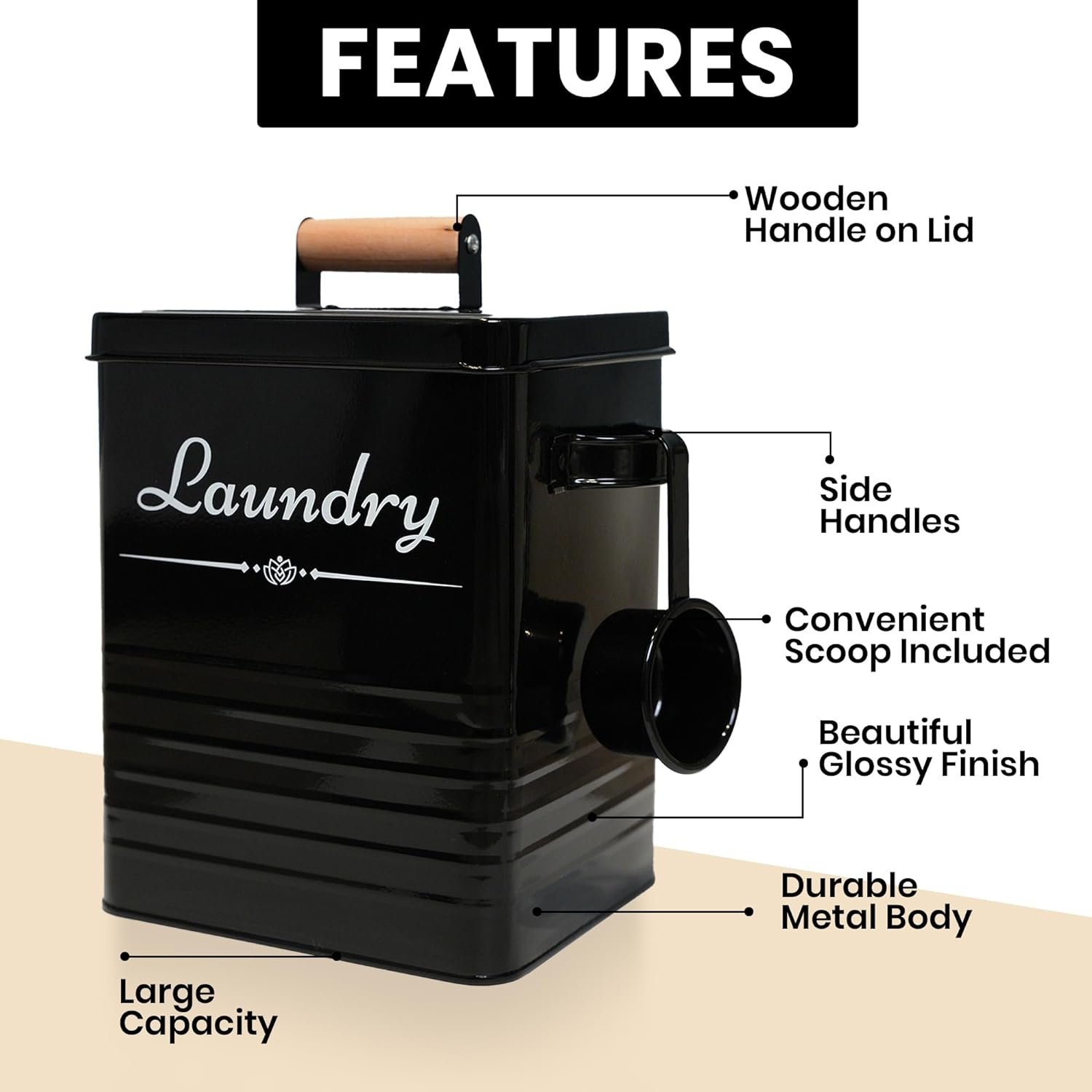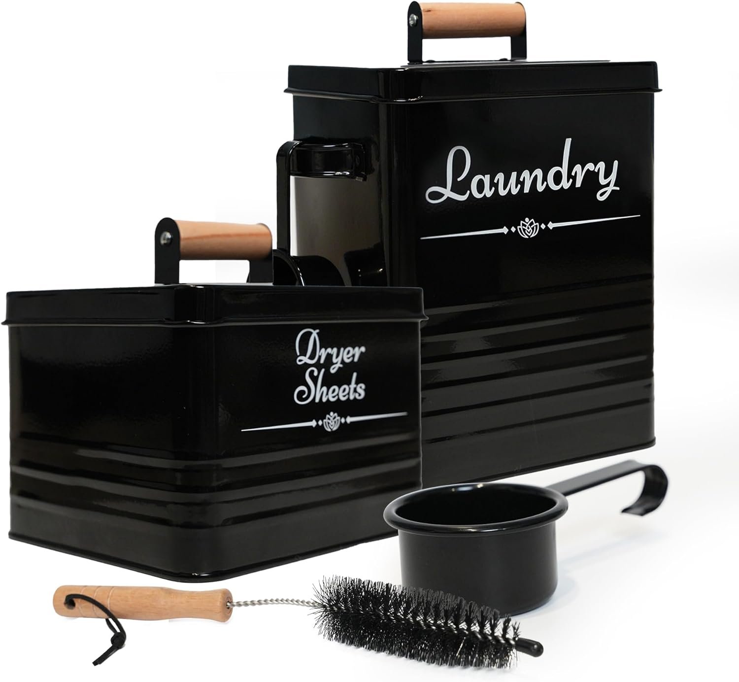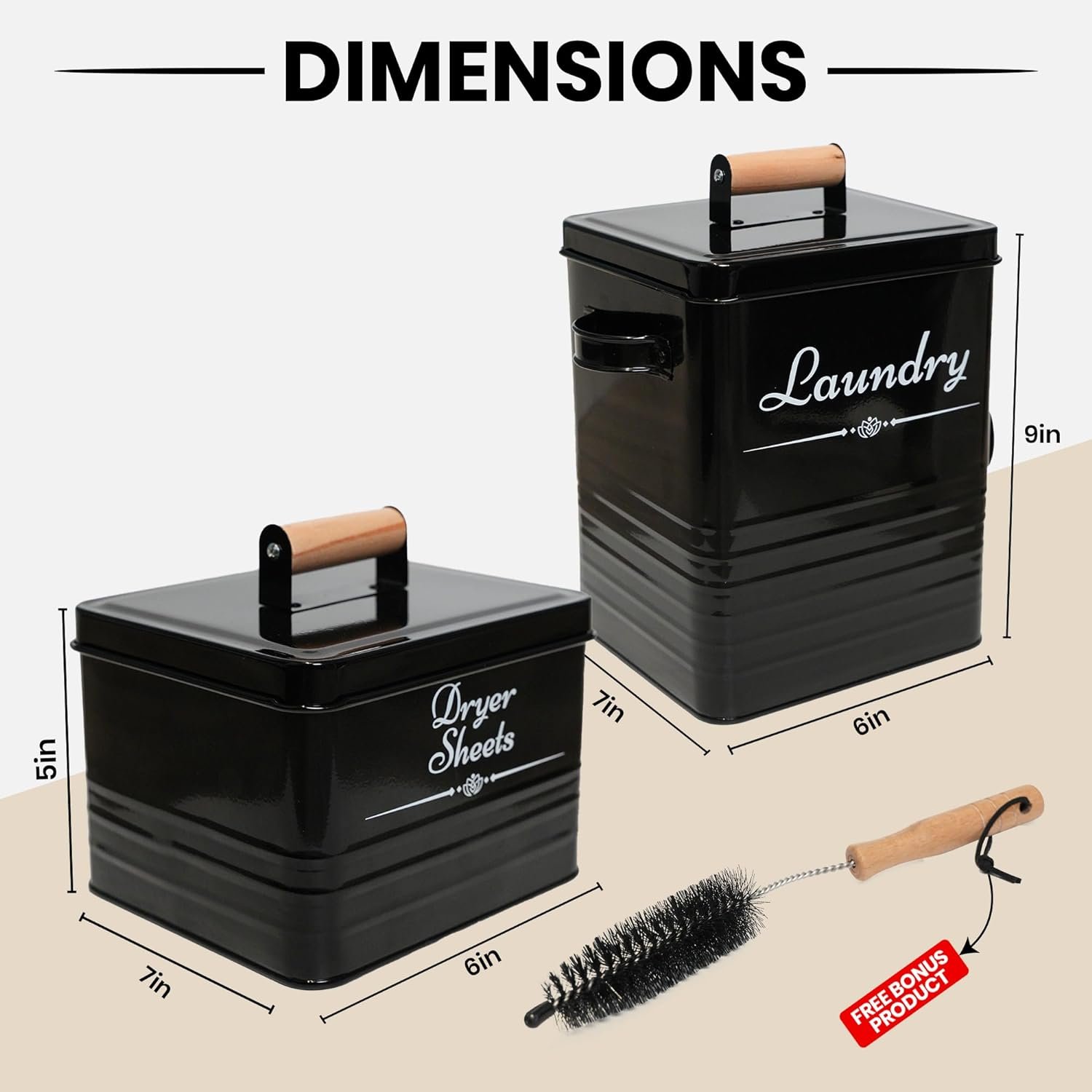✅【FARMHOUSE LAUNDRY ROOM ORGANIZATION】 Upgrade your laundry room with our modern farmhouse laundry soap containers and dryer sheets holder set. Our elegant metal, glossy containers feature wooden handles on lids for practical & stylish storage. Available in 2 colors Black & Beige. Ideal gift for housewarming.