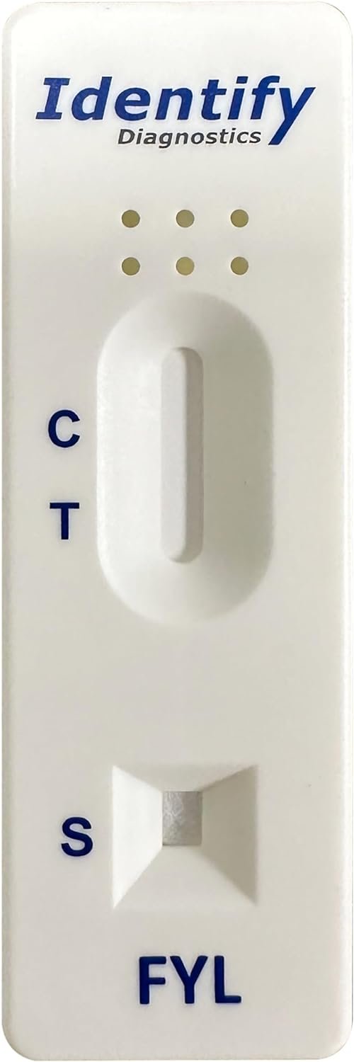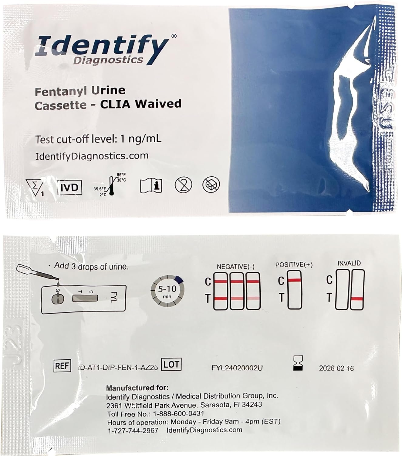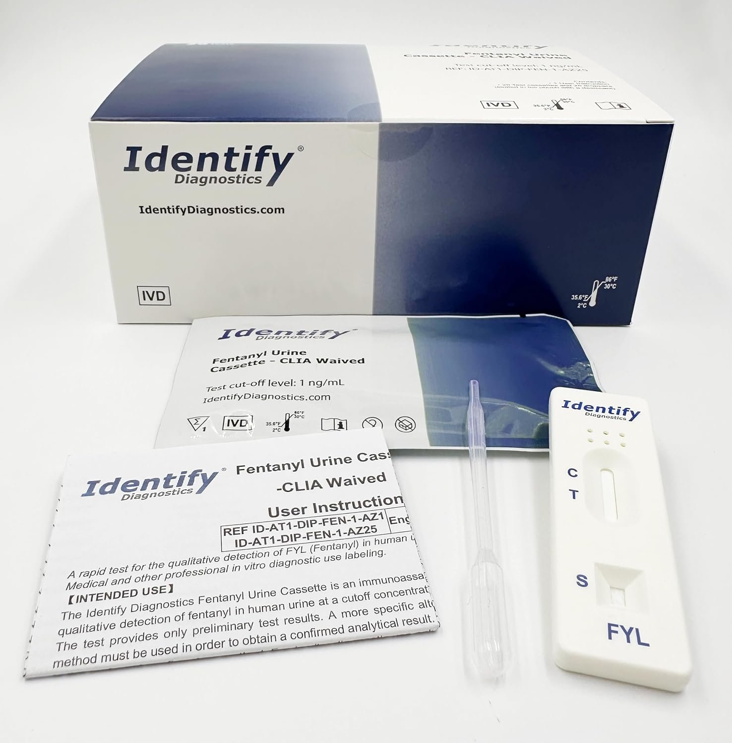 The Identify Diagnostics Fentanyl Urine Drug Test Cassette is a medical diagnostic tool designed to detect the presence of fentanyl metabolite in human urine samples. This product, which is CLIA waived and has received 510(k) clearance, is intended for both clinical and non-clinical settings where a quick and reliable test is needed. Each box contains 25 individually sealed tests. Each test kit includes a cassette and a pipette dropper, which simplifies the testing process. To use, one simply places three drops of human urine into the reservoir of the cassette using the provided pipette dropper. This fentanyl drug test is high sensitivity, detecting fentanyl concentrations at 1 nanogram per milliliter (ng/ml). This high sensitivity makes it an excellent choice for monitoring fentanyl in various scenarios, including medical screening and law enforcement. Results are rapid, appearing within 5 to 10 minutes, allowing for swift decision-making. Overall, the Identify Diagnostics Fentanyl Urine Drug Test Cassette is a reliable and efficient option for detecting fentanyl in urine, providing quick and accurate results with ease of use that is suitable for a variety of professional and nonprofessional settings.