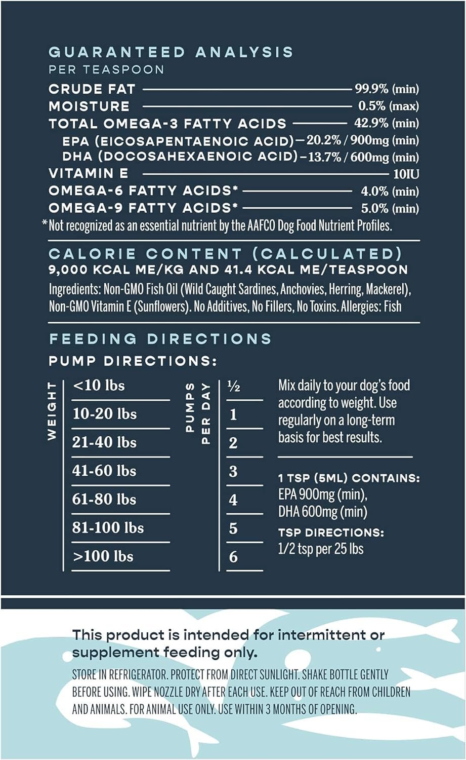 Feeding guide: Feed this fish oil liquid as cat or dog food toppers by adding the recommended amount to dog food or cat food; 48 teaspoons per 8-ounce bottle; under 25lbs, give ½tsp; 25-50lbs, give 1tsp; 51-75lbs, give 2tsp; use within 3 months once open