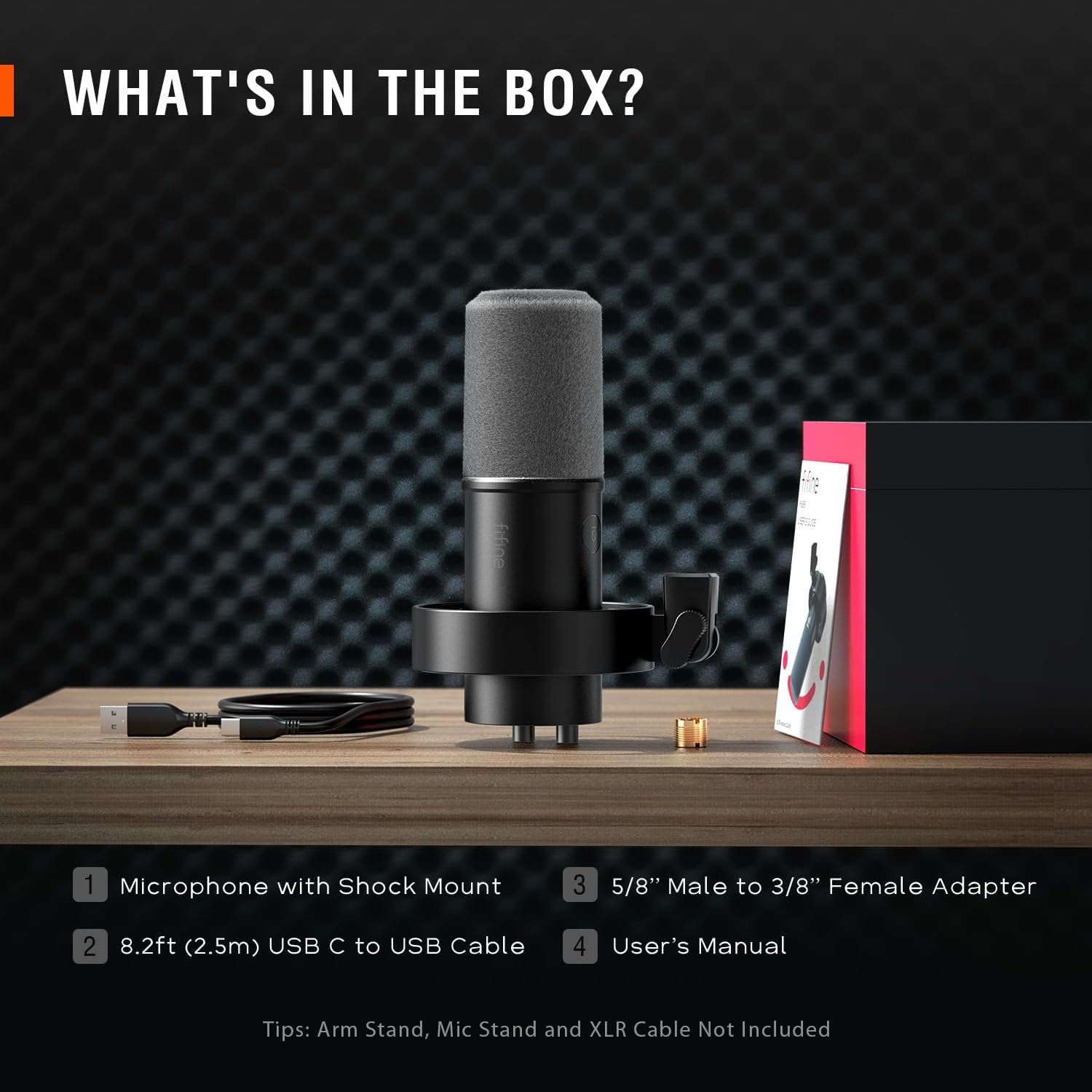 Warm Tips: 1. The recording studio product (XLR cable, boom arm, mic stand not included) comes with a dynamic microphone with shock mount, an 8.2ft (2.5m) USB C to USB cable, a 5/8” to 3/8” adapter, a user’s Manual. 2. When using XLR connection, it is suggested to use XLR to XLR cable for more stable audio. 3. All function keys are only available for USB connection.