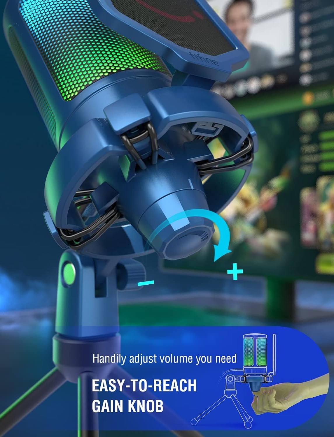Stable Design-Scientific tripod design of the gaming microphone strengthens the stability of stand, with the blue shape, which makes the whole more steady. Attached with pop filter and shock mount, the RGB PC mic makes your teammates or audience hear less popping noise, while reducing vibration caused by operating mouse and keyboard.