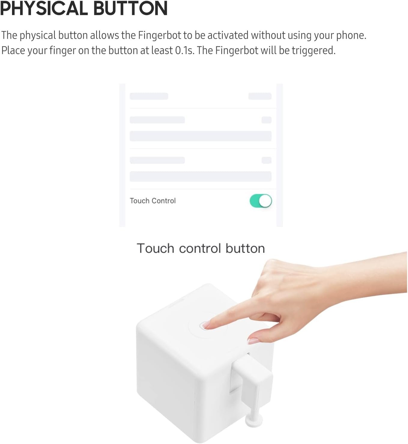 Touch Control: The physical button allows the Fingerbot to be activated without using your phone. Place your finger on the button at least 0.1s. The Fingerbot will be triggered.