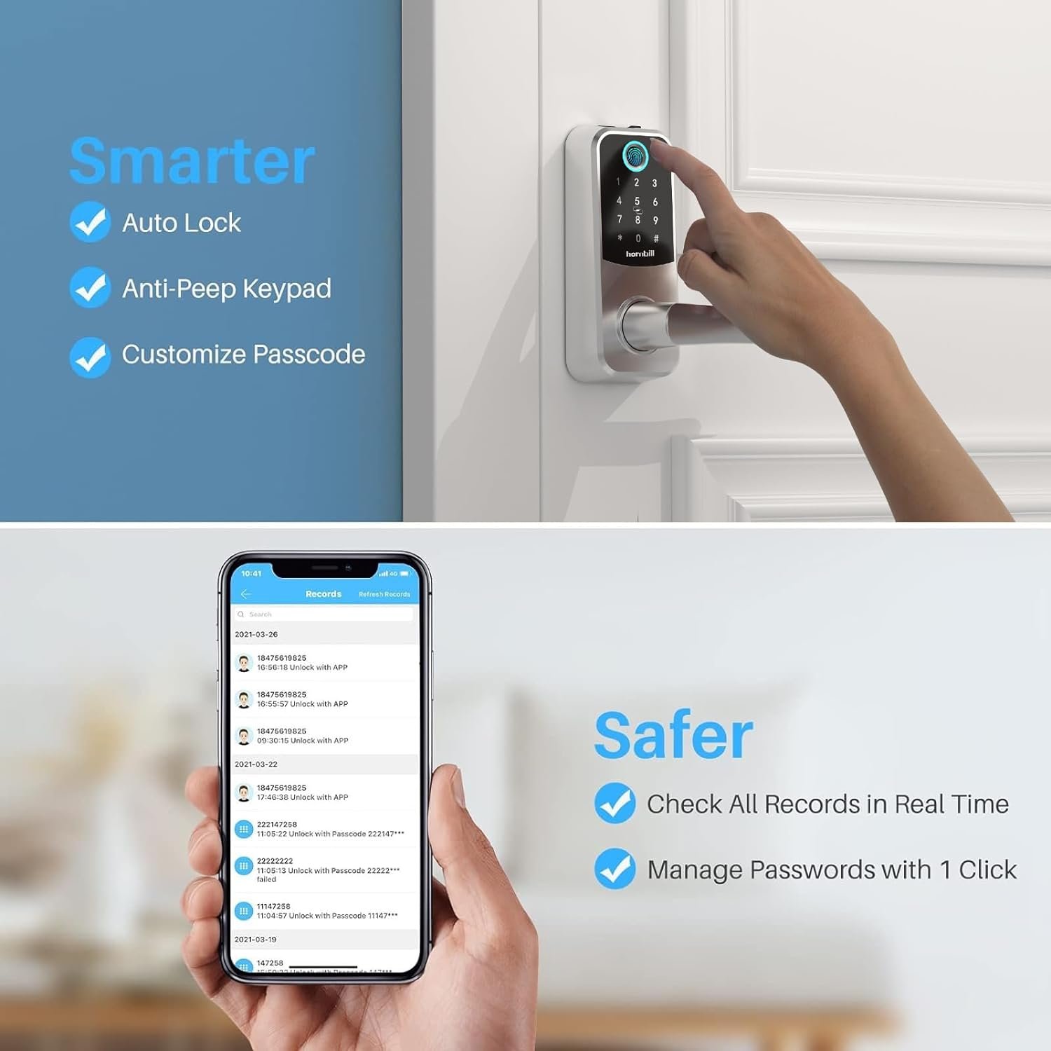 Smarter & More Convenient>>You could check all Lock operation records in real time for home security system. This door lock with keypad allows you Generate Permanent, One-time, or Customized passcode for guests, friends, housekeepers. You could authorize multiple administrators for better management.