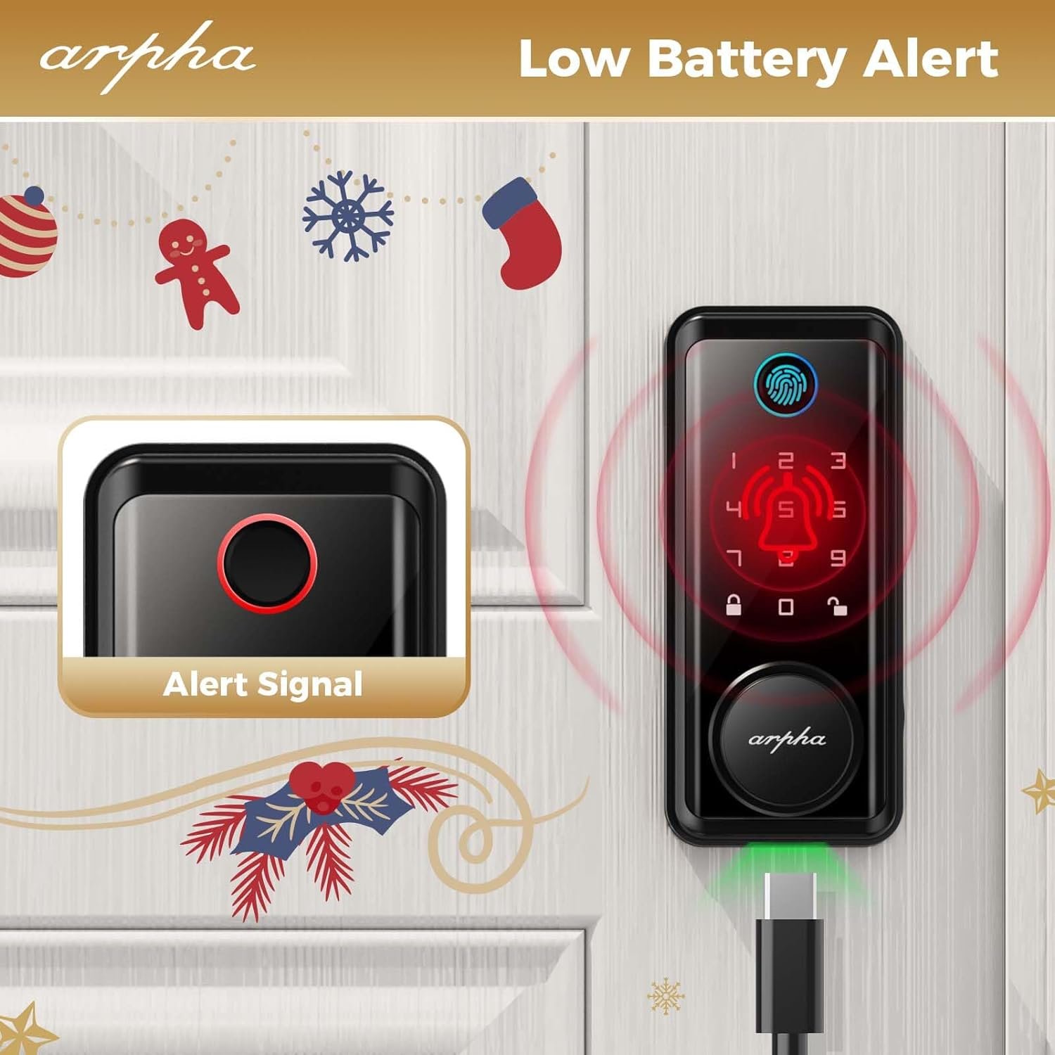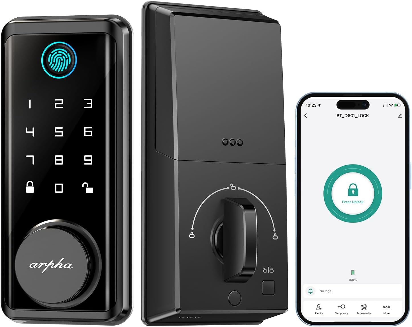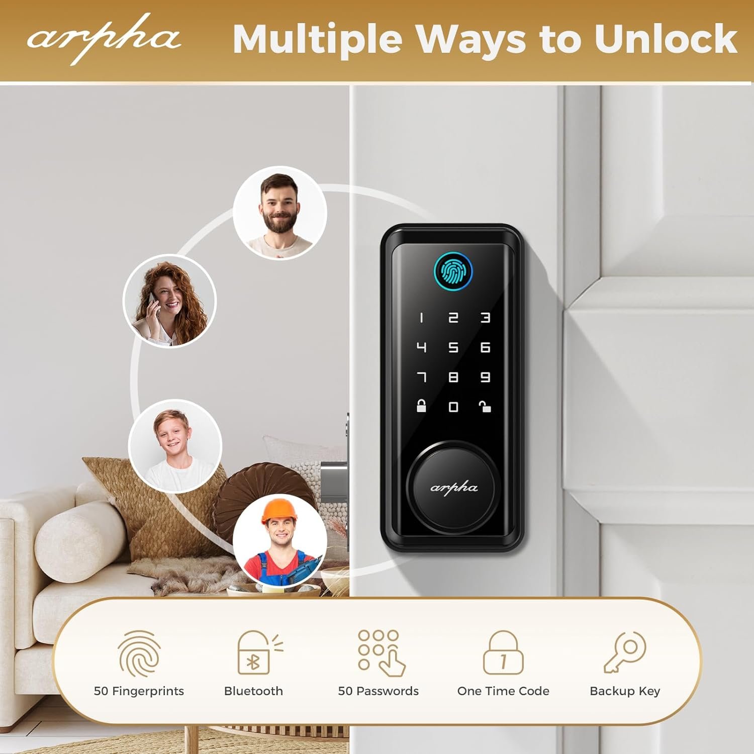 🔒 5 Ways to Unlock: Arpha smart door lock could be unlocked via APP Access, Fingerprint Touch ID, Keypad Code, Traditional Key Unlock. Never get locked out again with multiple secure ways to access your home.