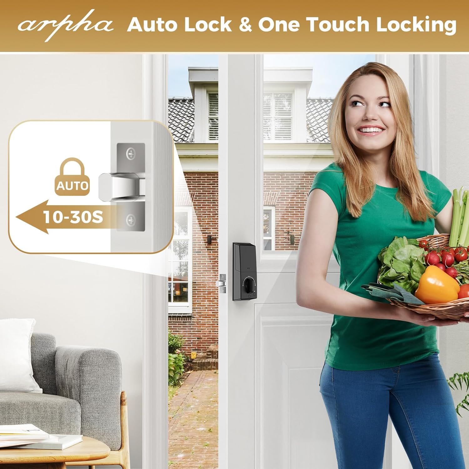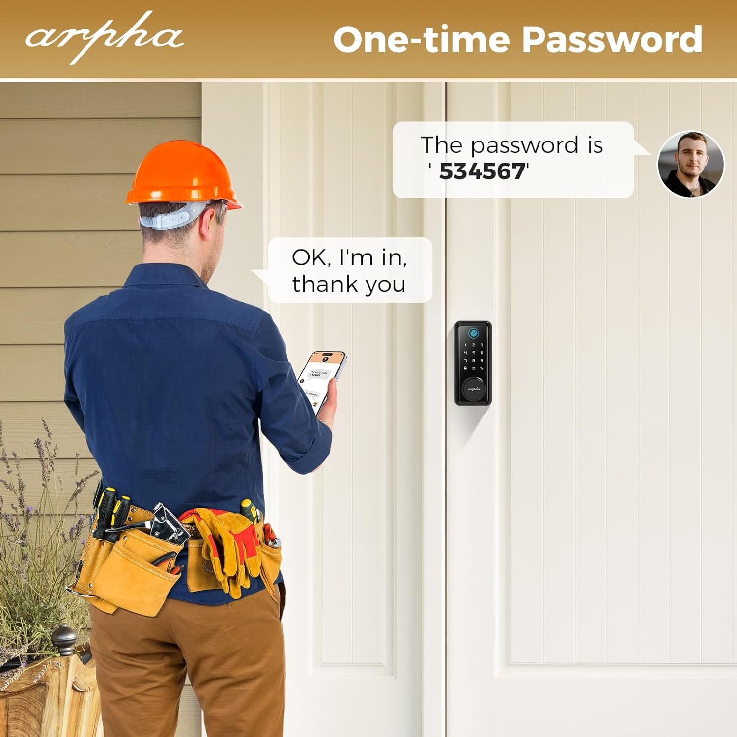 📱APP Control: With the Arpha app, you can share and customize temporary passwords with others, monitor the power of the lock and check unlock/lock records in real time. (ASIN: B09YHFG933) Arpha Gateway required for remote control this keyless entry door lock.