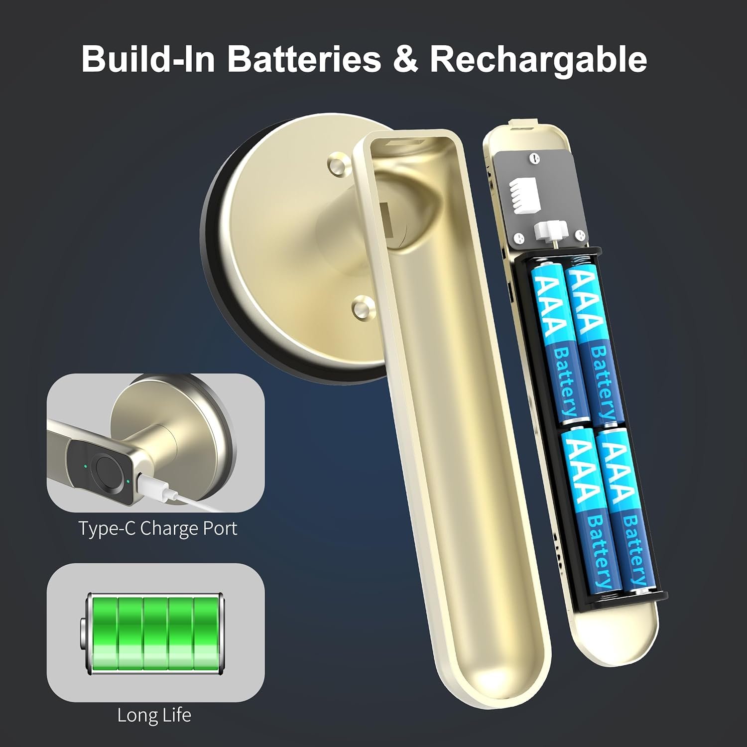 【Keyless Entry】Say goodbye to keys! Fingerprint One Touch Unlock. Fingerprint door knobs is equipped with 160*160 pixel fingerprint sensor, 0.1 seconds to recognize your fingerprint. Our fingerprint door lock provides easier and more convenient access to your home or office. It requires 4*AAA batteries and can be used for up to 10-12 months. When the battery is dead, there will be a low-battery reminder, and it can be USB emergency charging.