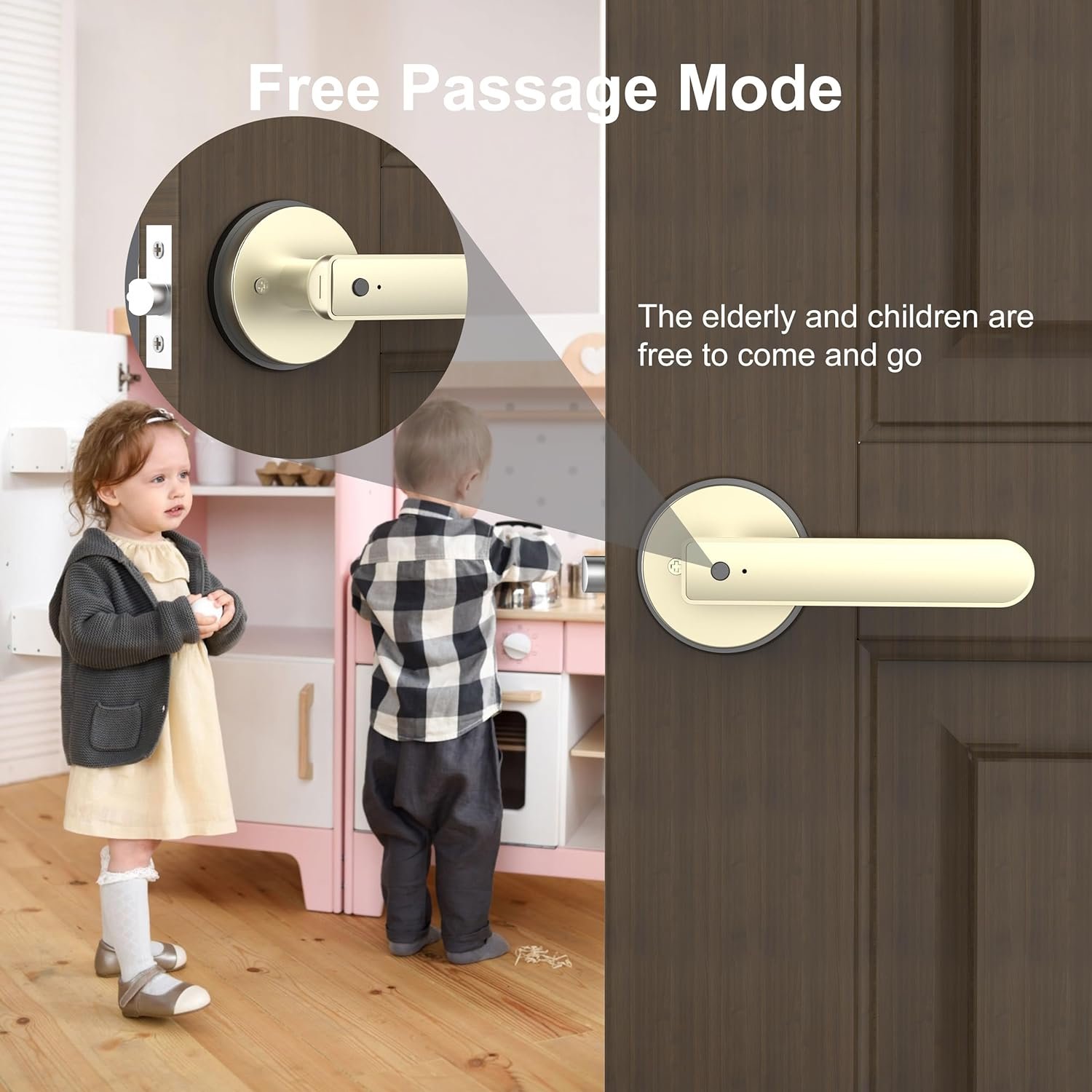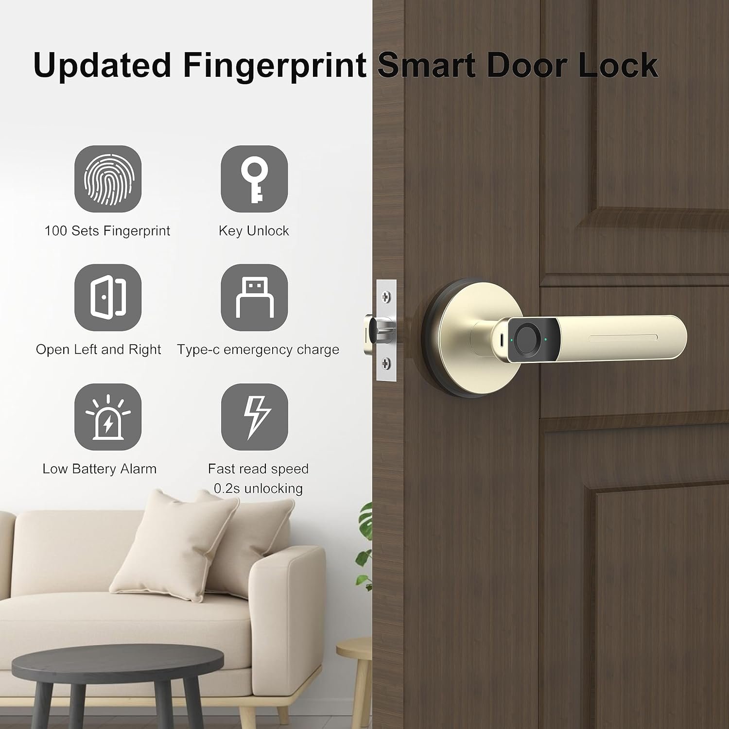 【2 Ways to Unlock】Advanced gold fingerprint door knob: fingerprint unlock, back-up keys unlock. Adjustable door handle for left or right, 5s auto-lock and free passage modes.