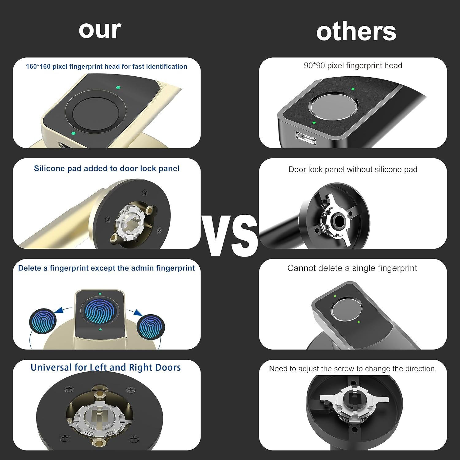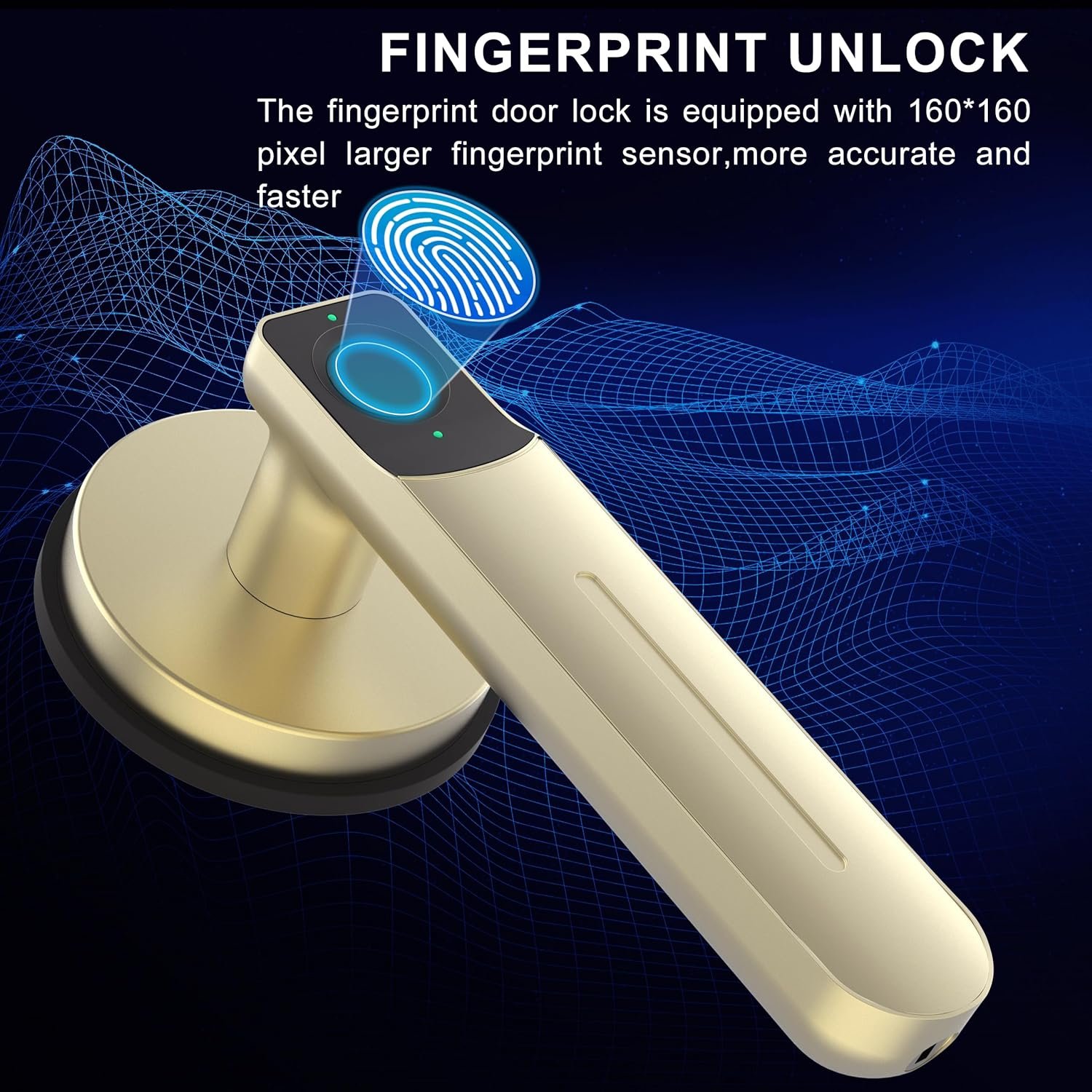 The smart door knob is equipped with an upgraded 160*160 fingerprint reader.Our fingerprint door handle uses advanced biometric technology to ensure that only authorized users can enter your home.