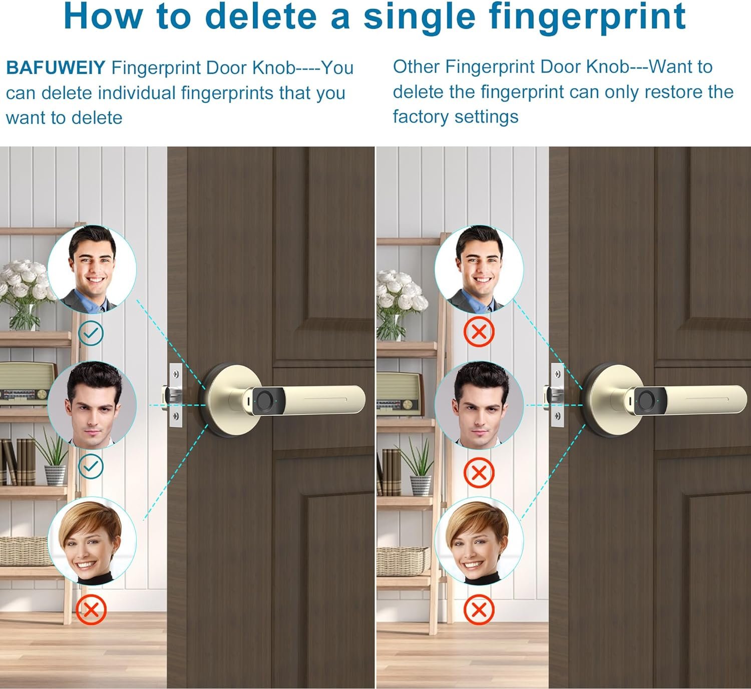 【Delete a single fingerprint 】Fingerprint door lock When you want to delete a person’s fingerprint, you only need to press the setting button for 7 seconds and then enter the fingerprint you want to delete, no longer have to worry about deleting the fingerprint and need to restore the factory settings! But the admini fingerprint cannot be deleted individually.