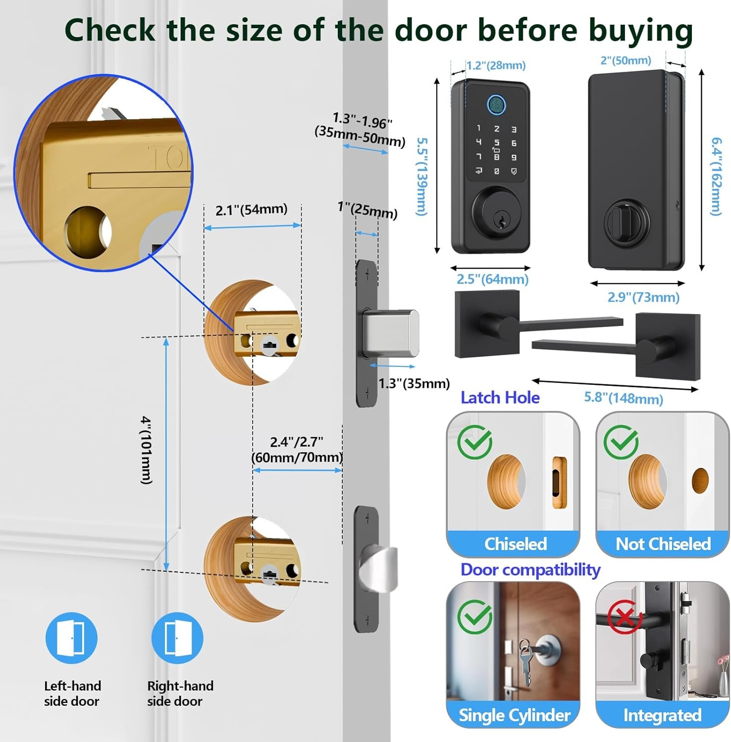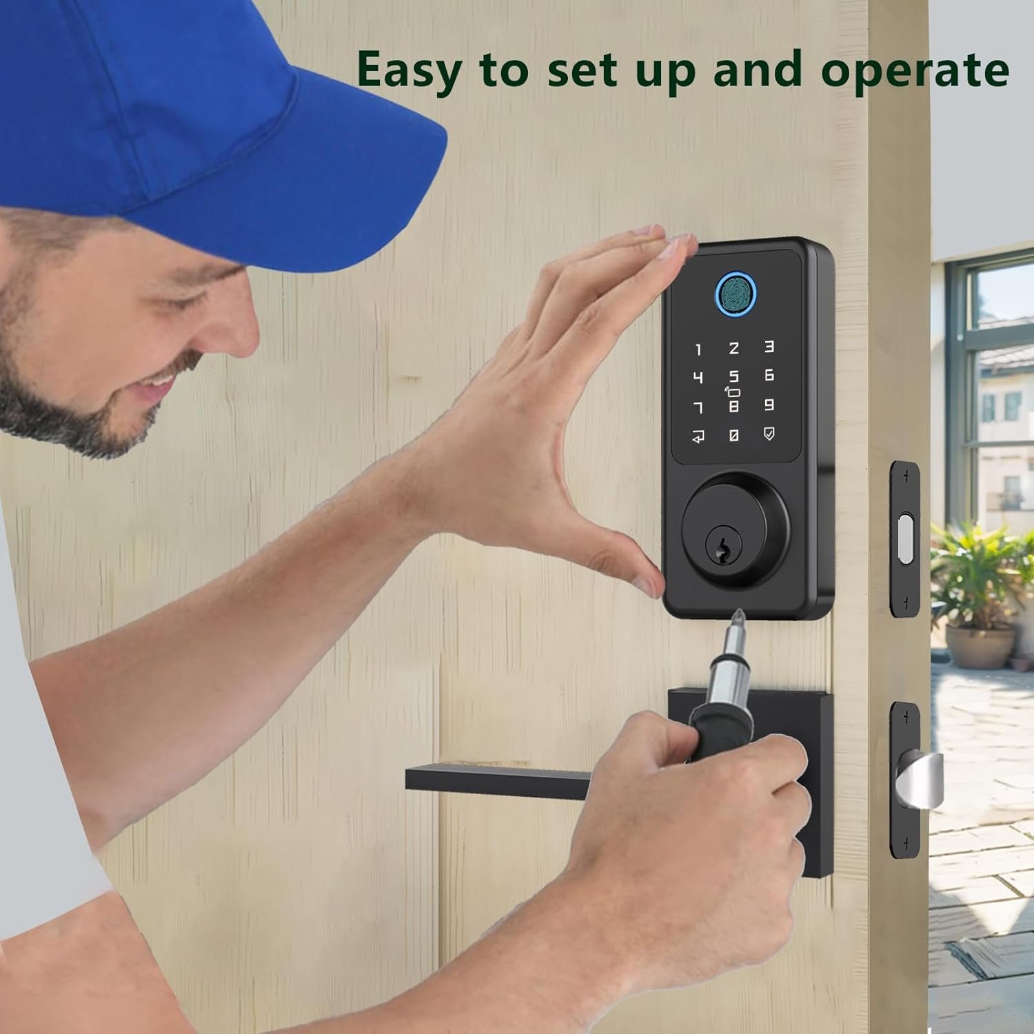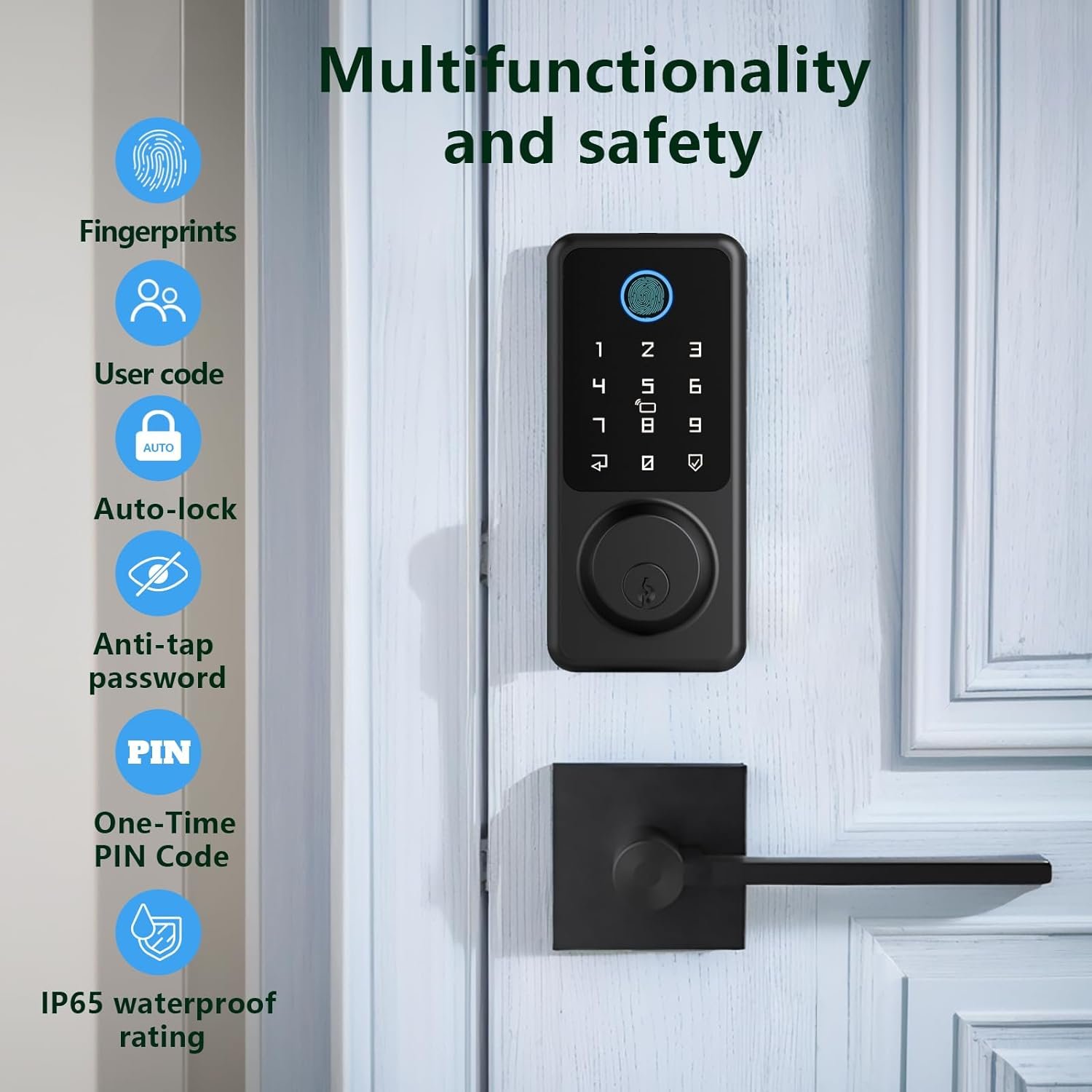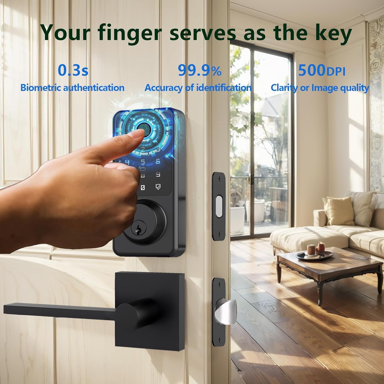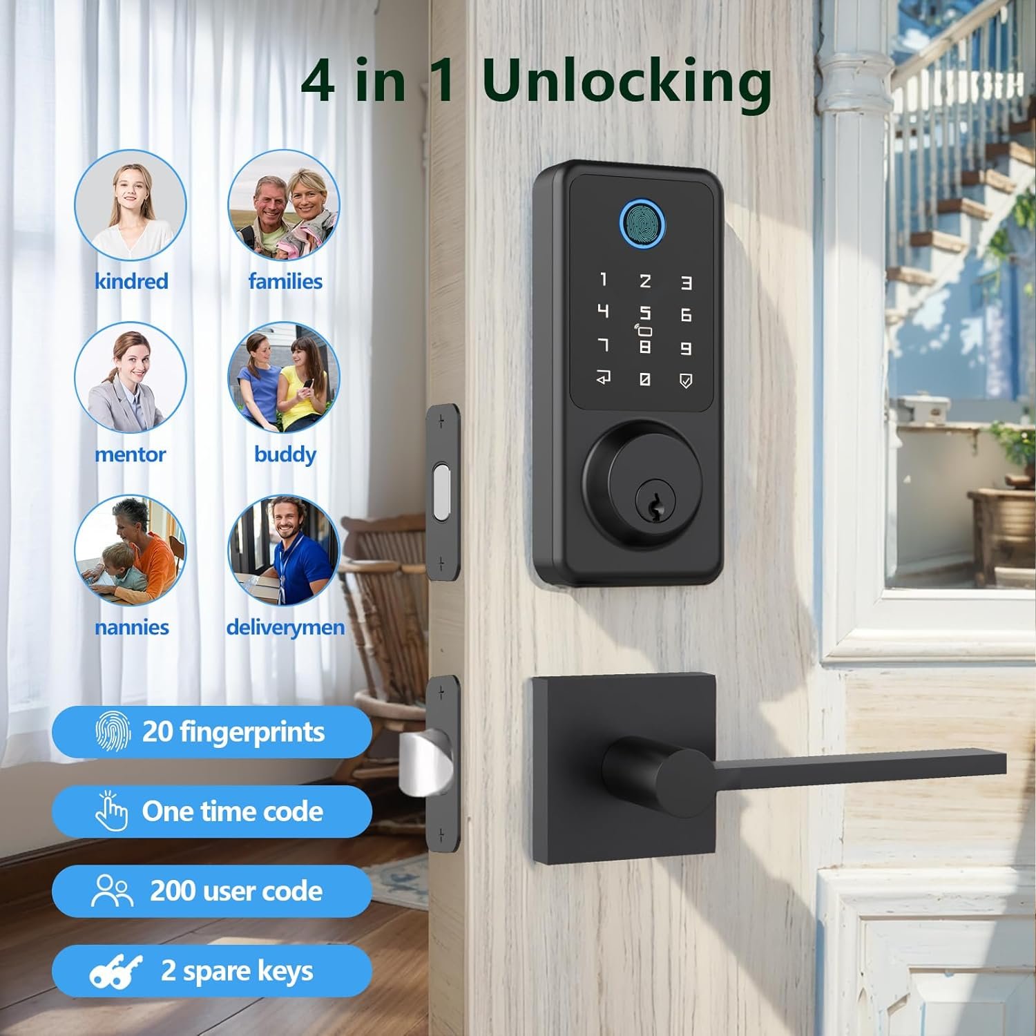 4- in-1 Smart Keyless Entry Door Lock: The security keyless entry door lock gives you 4 ways to unlock doors: fingerprint, APP control, passcode, physical key, You can rest thanks to the possibility of generating up to 200 passcodes with different validity periods and sending them to your family, friends, or dog walker. Forget about having to rush home to open the door. The smart lock for front door can be unlocked in 0.5s, versatile for homes, offices, and hotels.