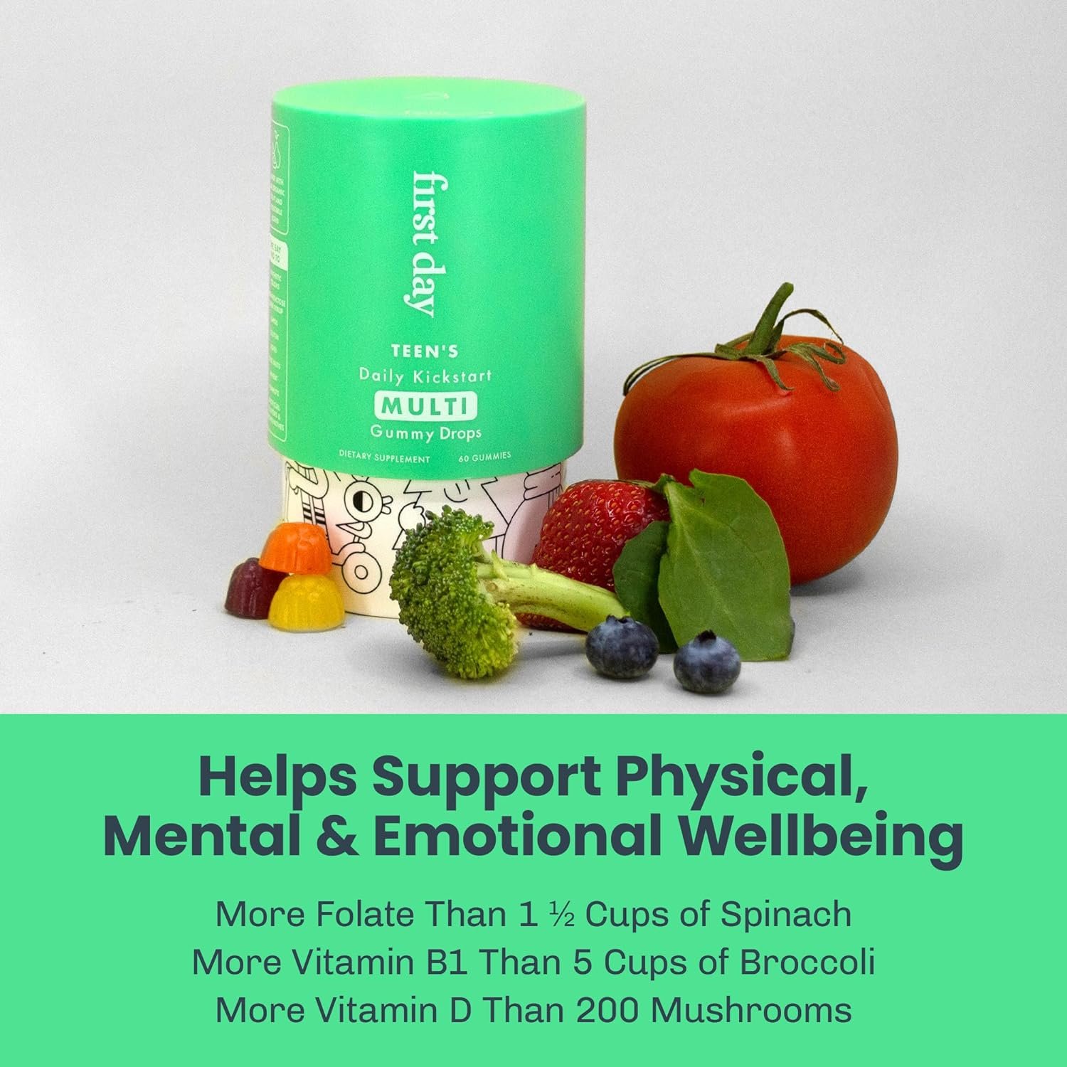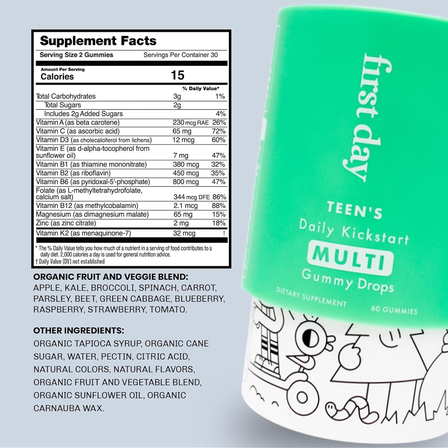 Essential Nutrients for Teens for Ages 14+: Our multivitamin gummy drops fill in the gaps left by a normal teenage diet, focusing on the 12 micronutrients teens most commonly lack; vitamins A, B1, B2, B6, B9, B12, C, D3 and K2, Magnesium, Folate and Zinc — it’s all here to help with everything from heart and brain function to immune and energy support