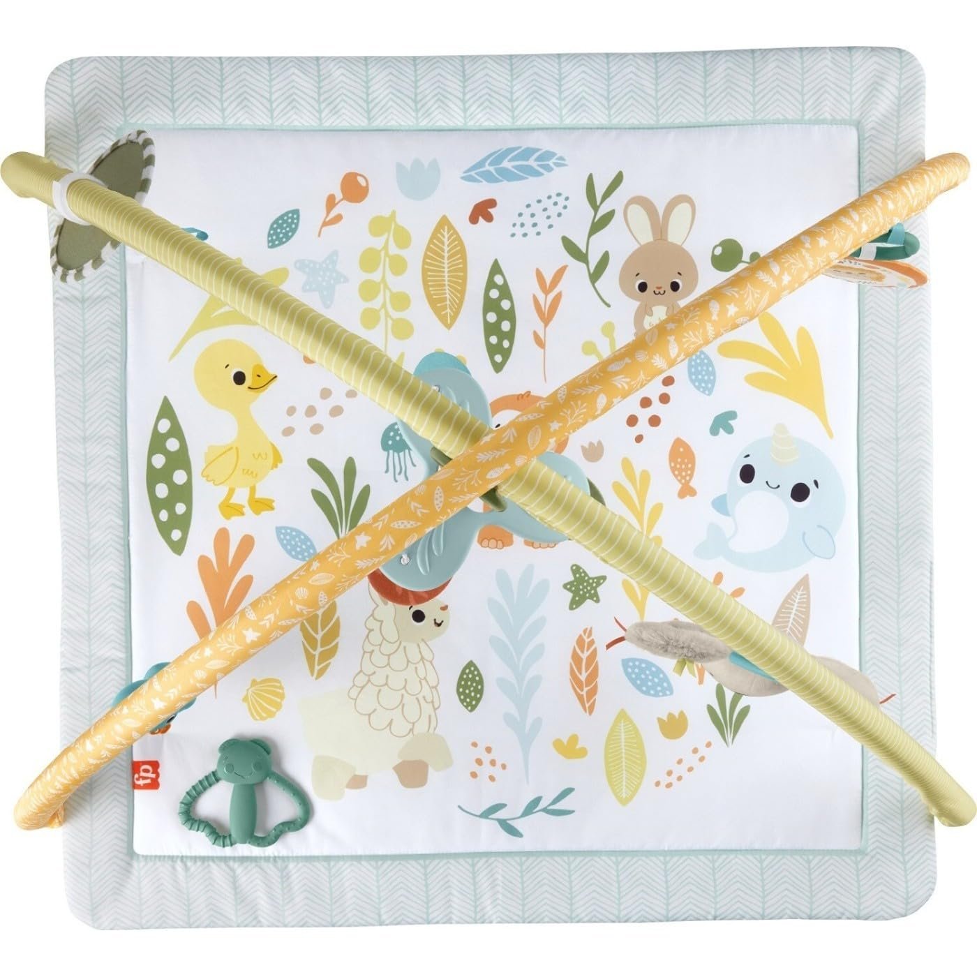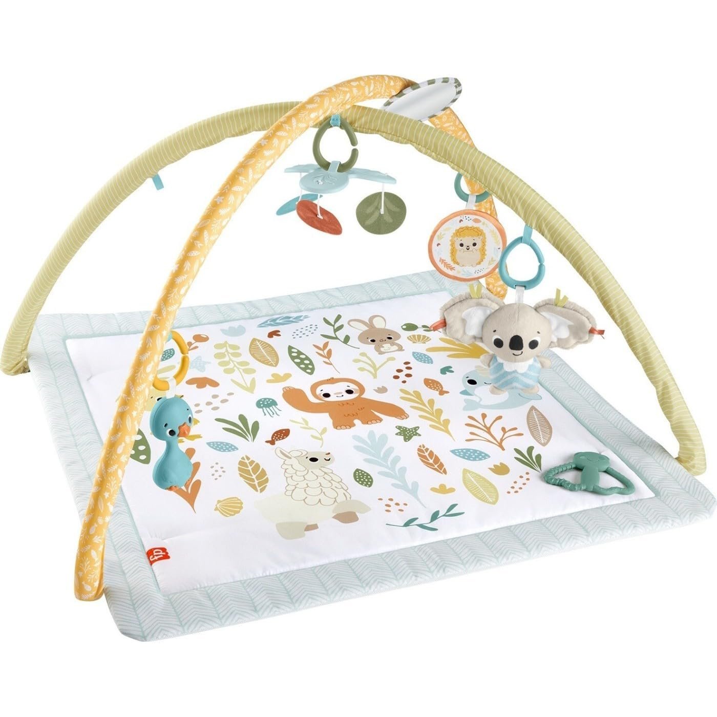 The Fisher-Price Simply Senses Newborn Gym is a colorful baby activity mat that grows with your little one from lay & play and tummy time to travel. The gym features an arch with 6 repositionable sensory toys including a portable plush koala with a soft chime and a take-along mobile that can be attached to a stroller for fun on-the-go. Other sensory toys include a self-discovery mirror, goose rattle, BPA-free moth teether and soft crinkle toy that can be repositioned on the gym arch or used for travel play.