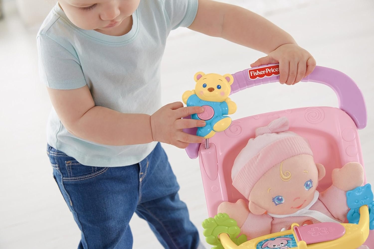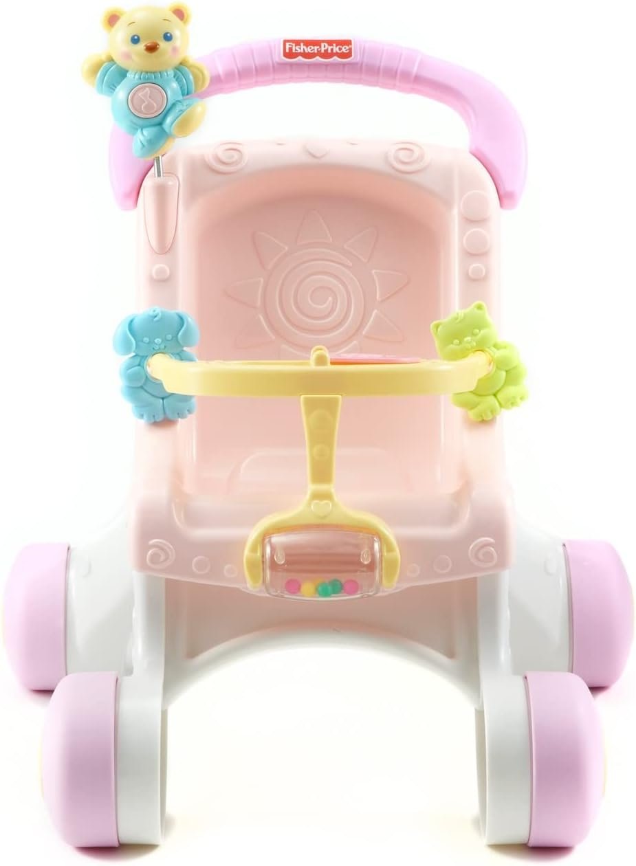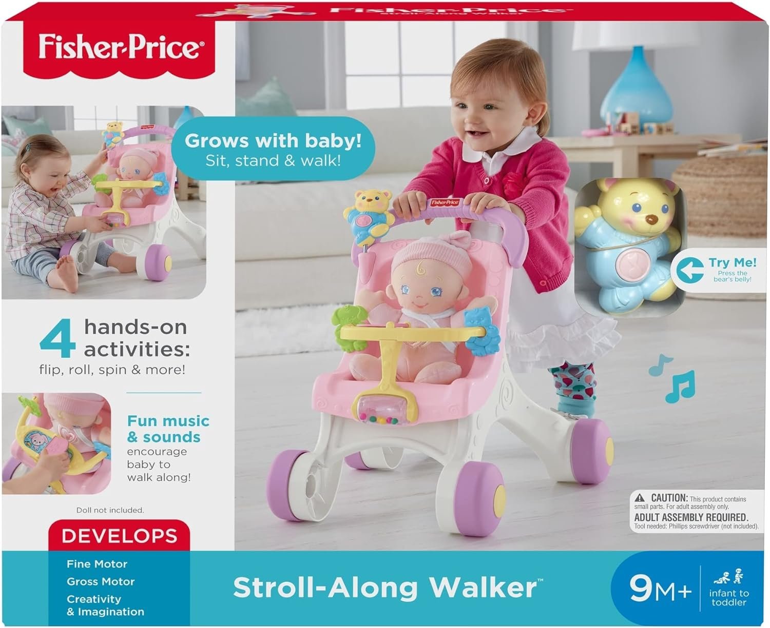 When your baby is ready for the new world of walking, the Fisher-Price Stroll-Along Walker is ready to lend steady support! The push toy’s wide, stable base and easy-grasp handle help steady first steps, and sweet music plays as baby strolls along. It’s a great way to encourage early pretend play and gross motor skill development—and it’s loaded with fun sit & play activities, too. Press the wiggly bear’s belly for musical rewards; enjoy hands-on fun with spinners, a roller bar and flipbook! There’s even room to take a friend along for a stroll! (Doll not included.)