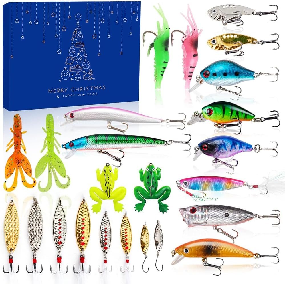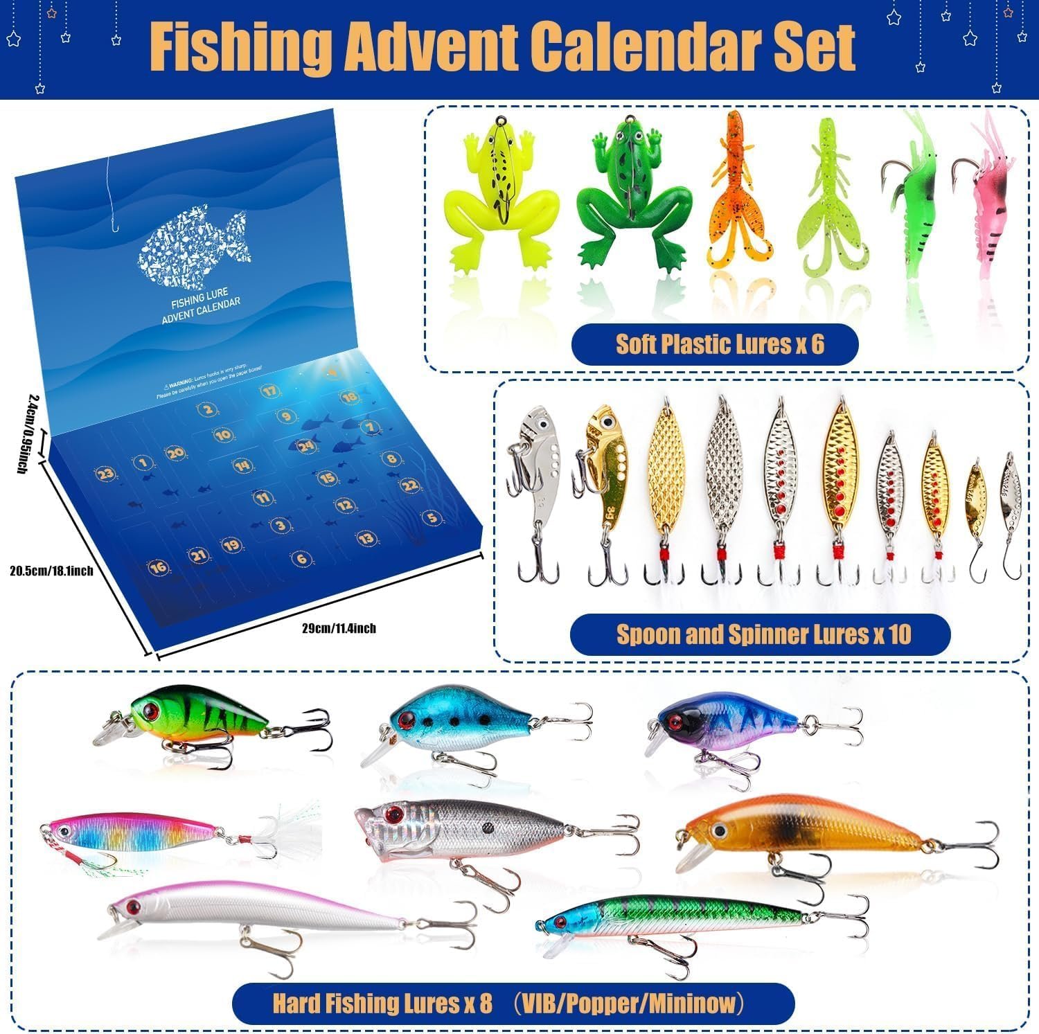 【MULTI-FUNCTIONAL BAIT SET】The 2023 Fishing Advent Calendar features 24 multi-purpose baits, including 8 hard baits, 6 soft baits and 10 spoon baits, neatly distributed in separate compartments; enjoy something different every day fishing experience that turns the holiday countdown into an unforgettable fishing season trip.