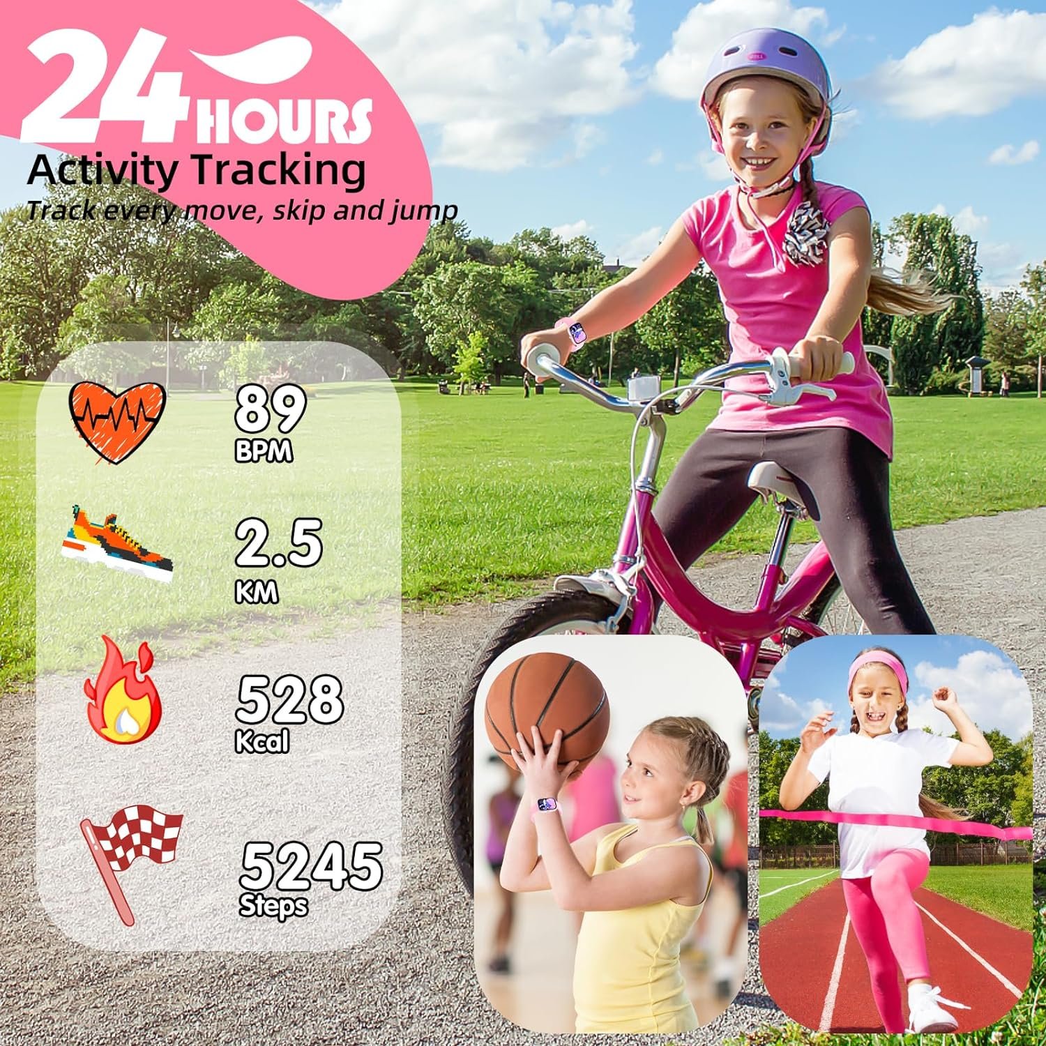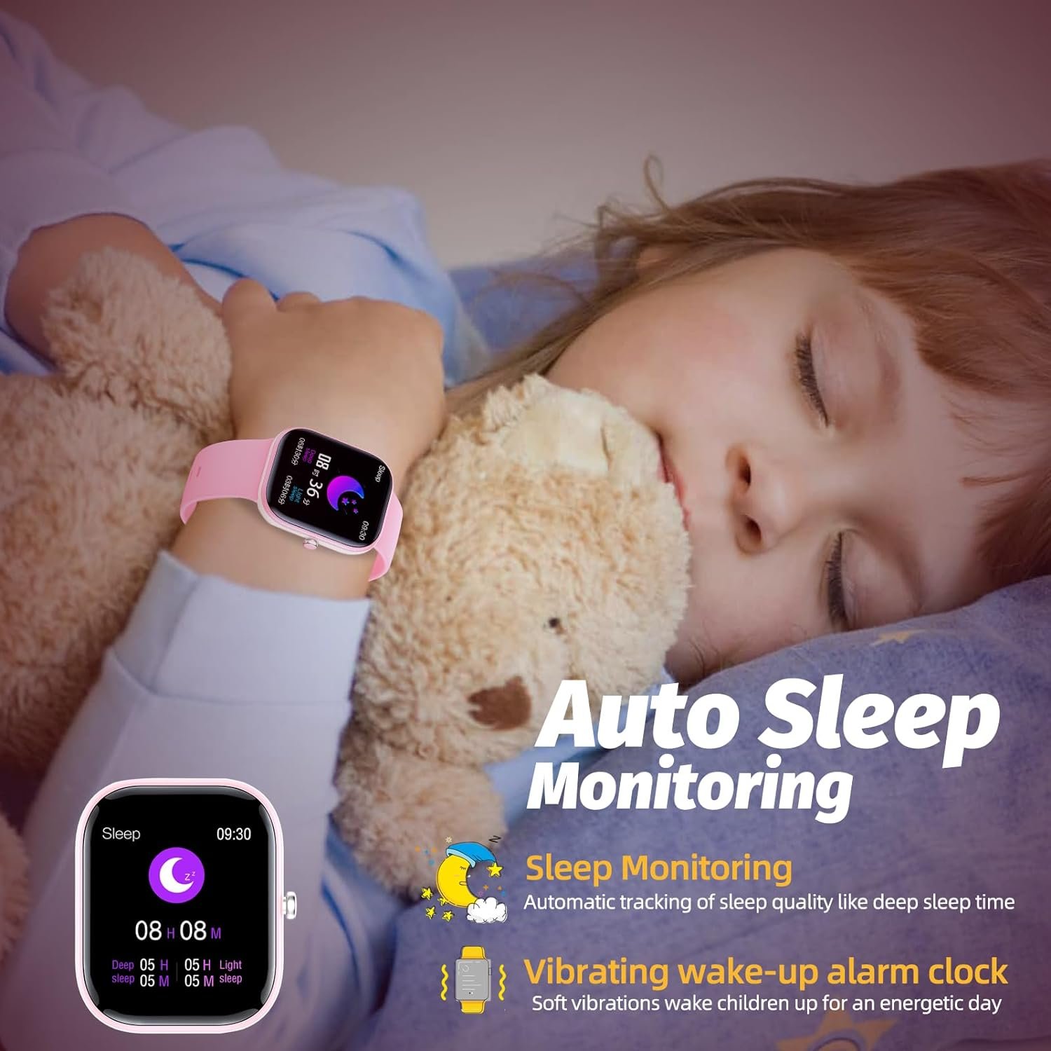 【24-HOUR NON-STOP HEALTH TRACKING】The smart watch for kids uses high-performance optical sensors to act as a fitness tracker in a timely and accurate manner, recording your child’s daily walking steps, distance and calories, continuously monitoring their heart rate and sleep quality, and presenting them with detailed data to help your child develop a good lifestyle.