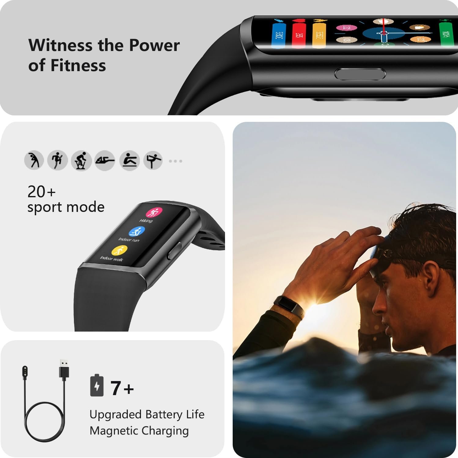 TAKE YOUR FITNESS FURTHER— FITVII activity tracker all day measures the calories burned, steps, and distance. Use 20 sports modes to exercise scientifically & level up your workouts by recording heart rate, calories, and more.