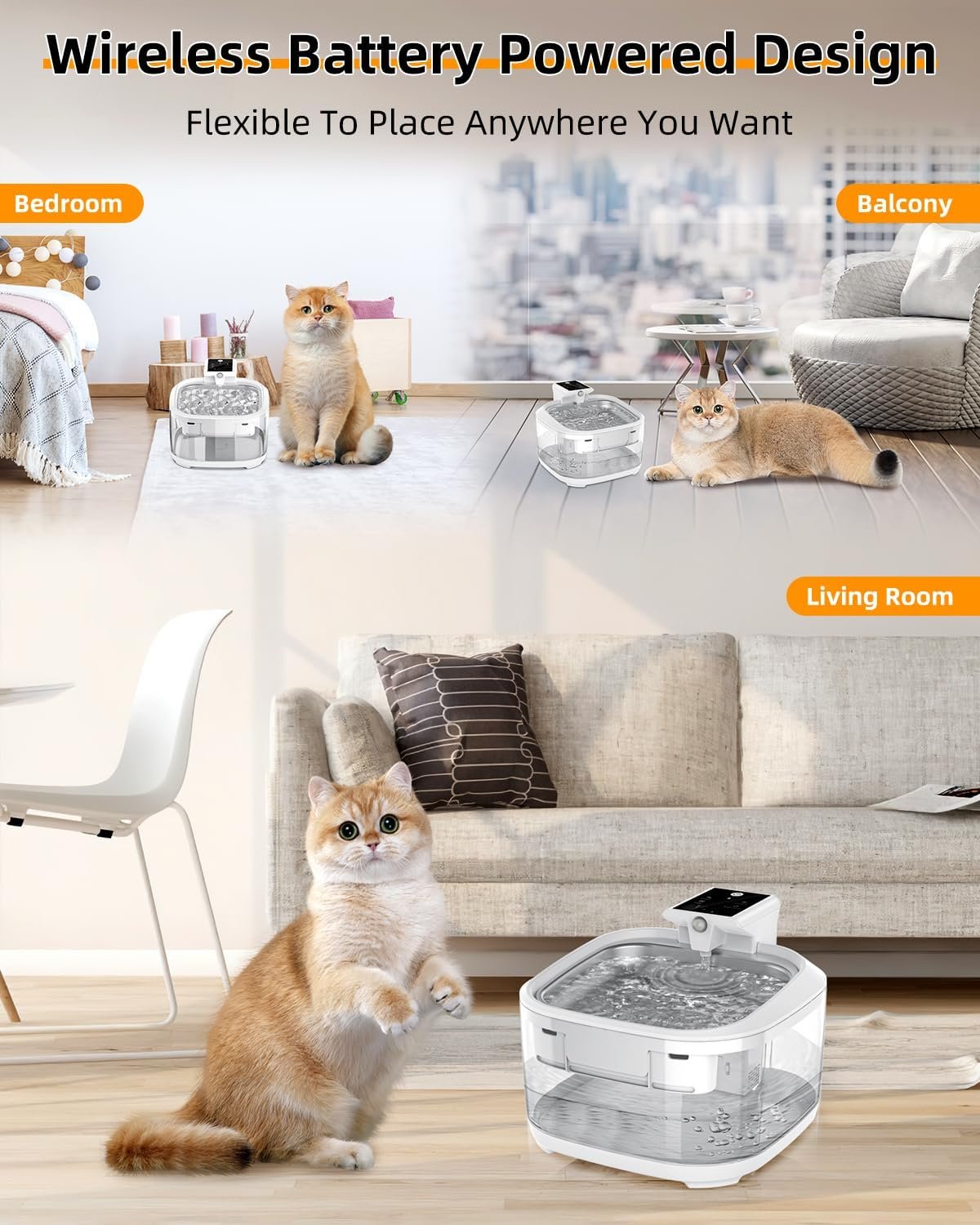 【Wireless Battery Operated Design】Fjzoys battery operated cat water fountain allows your pet to enjoy fresh, Clean water anywhere. For example: Your kitchen, Bedroom, Balcony, Yard, Outdoors, or beyond. New upgrade design, This cat fountain wireless pump and charging base are free from external wires, Shake off the cords trouble, Enjoy a new way of drinking water.