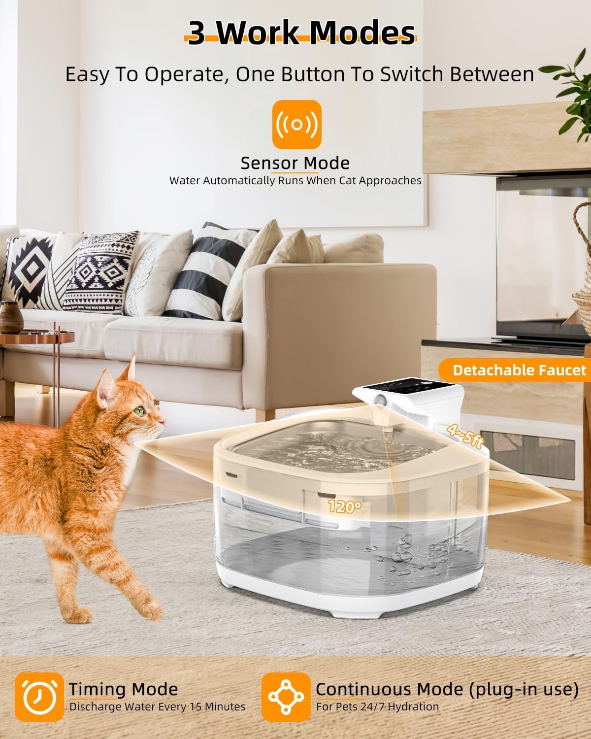【Three Water Modes】Easy to operate, Just one button to switch between 3 work modes: Sensor mode, Timing mode, Continuous mode, (This mode 24 hours uninterrupted water flow, Only supports plug-in use). In sensor mode, The water runs when cats approach(Within 4-5ft/120º, Provides 20 seconds of running water), You can also switch to Timer Mode that releases water every 15 minutes for 20 seconds. While conserving power, It also greatly stimulates their interest in drinking water.