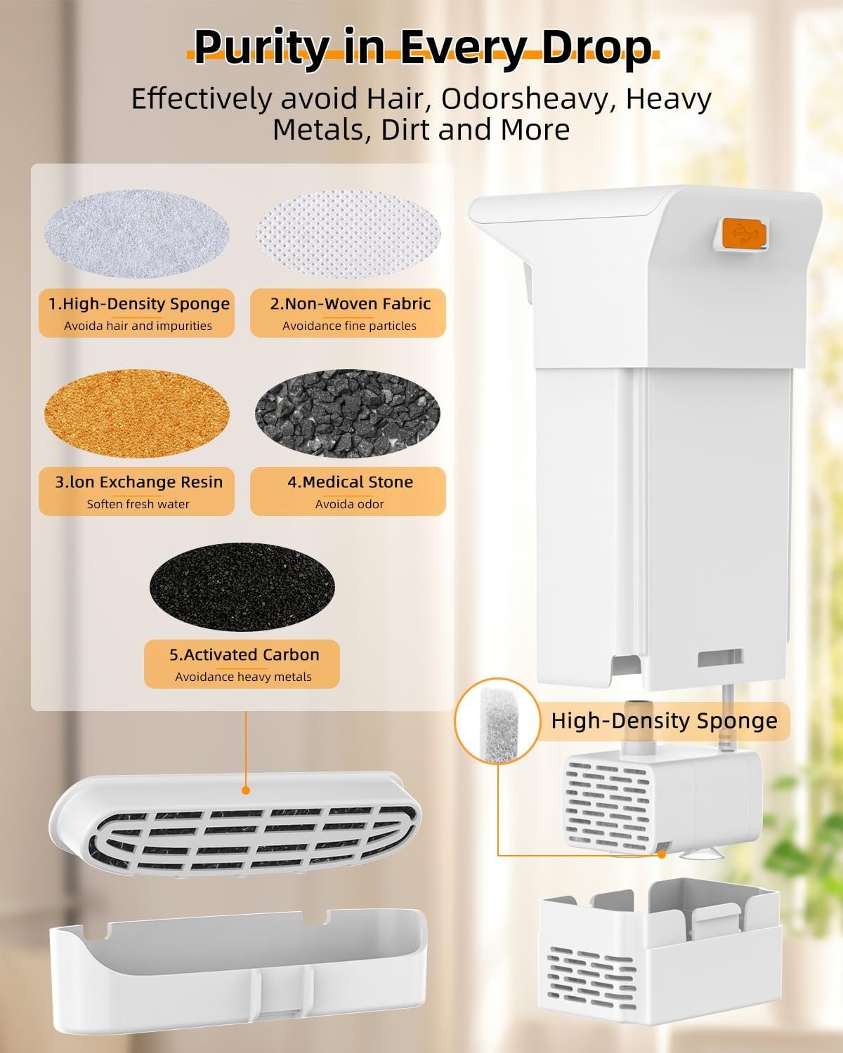 【Enjoy Every Sip of Fresh Water】Provide oxygen-enriched and better-tasting water for your cat. 1.Non-woven fabric could avoid hair and impurities; 2.Ion exchange resin could soften fresh water; 3.Activated carbon avoid odor; 4.Medical stone avoidance heavy metals and releases trace elements; 5.Quiet pump high-density sponge helps avoid fine particles.