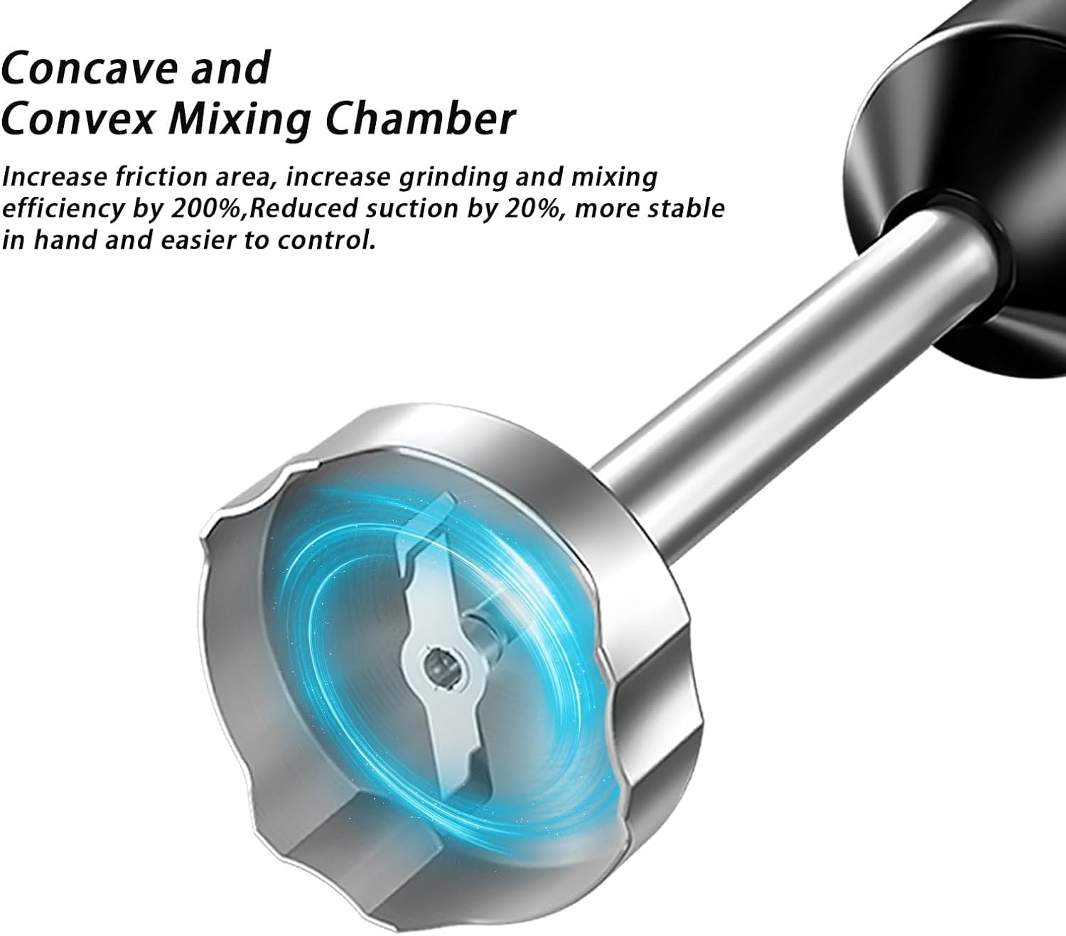 【Concave-Convex Mixing Chamber】:Our stick blender adopts a concave-convex mixing chamber,which Create 3 perfect vortices increases 200% active cutting surface and the food can be more fully rubbed and impacted,resulting in a more delicate grinding and stirring effect.