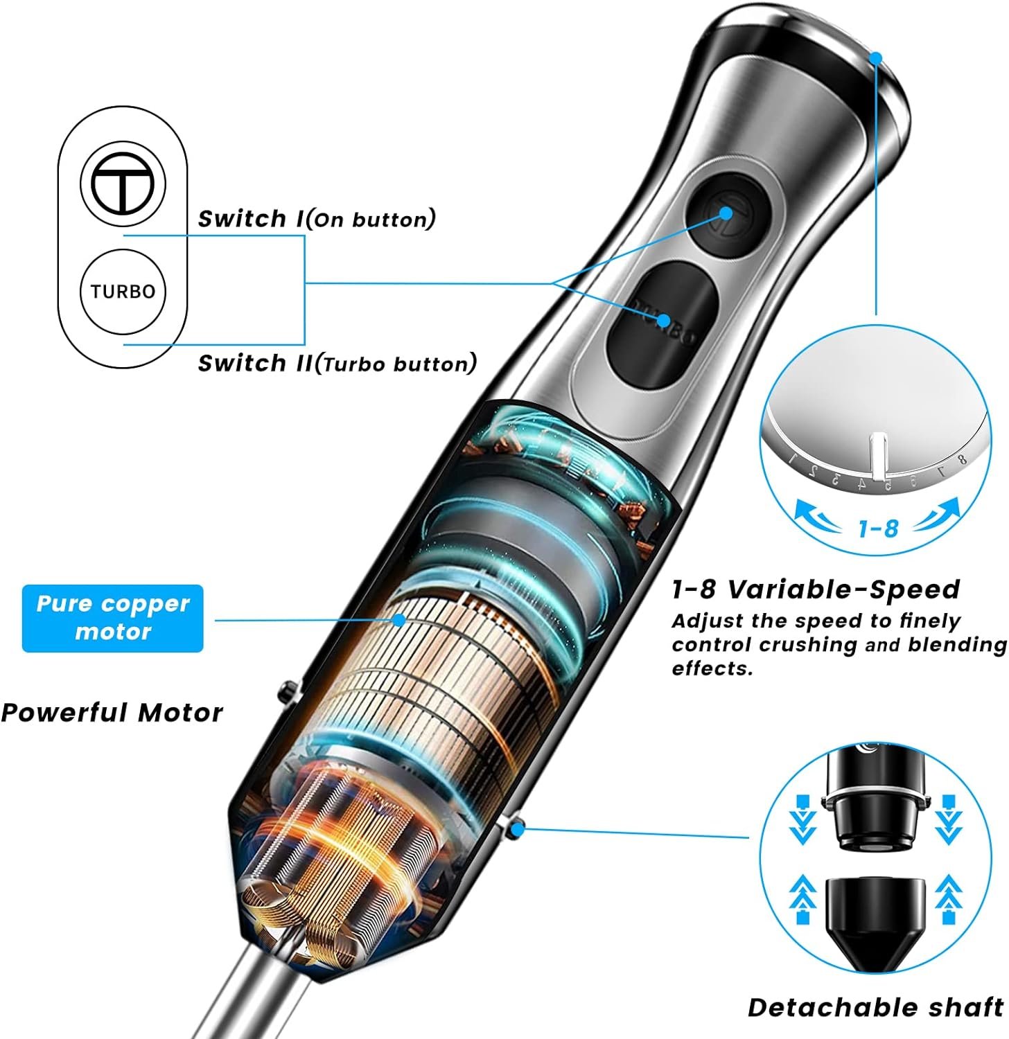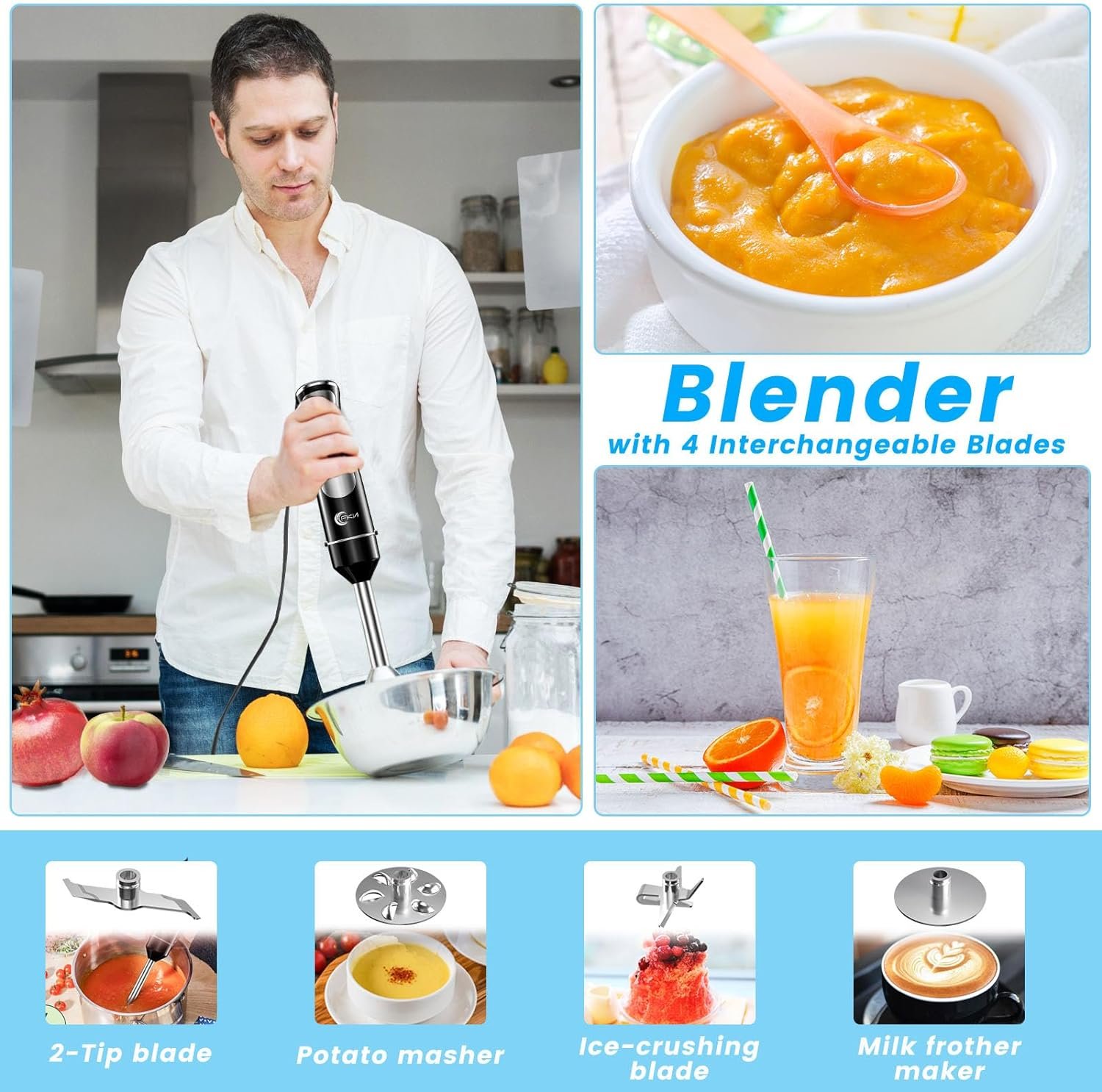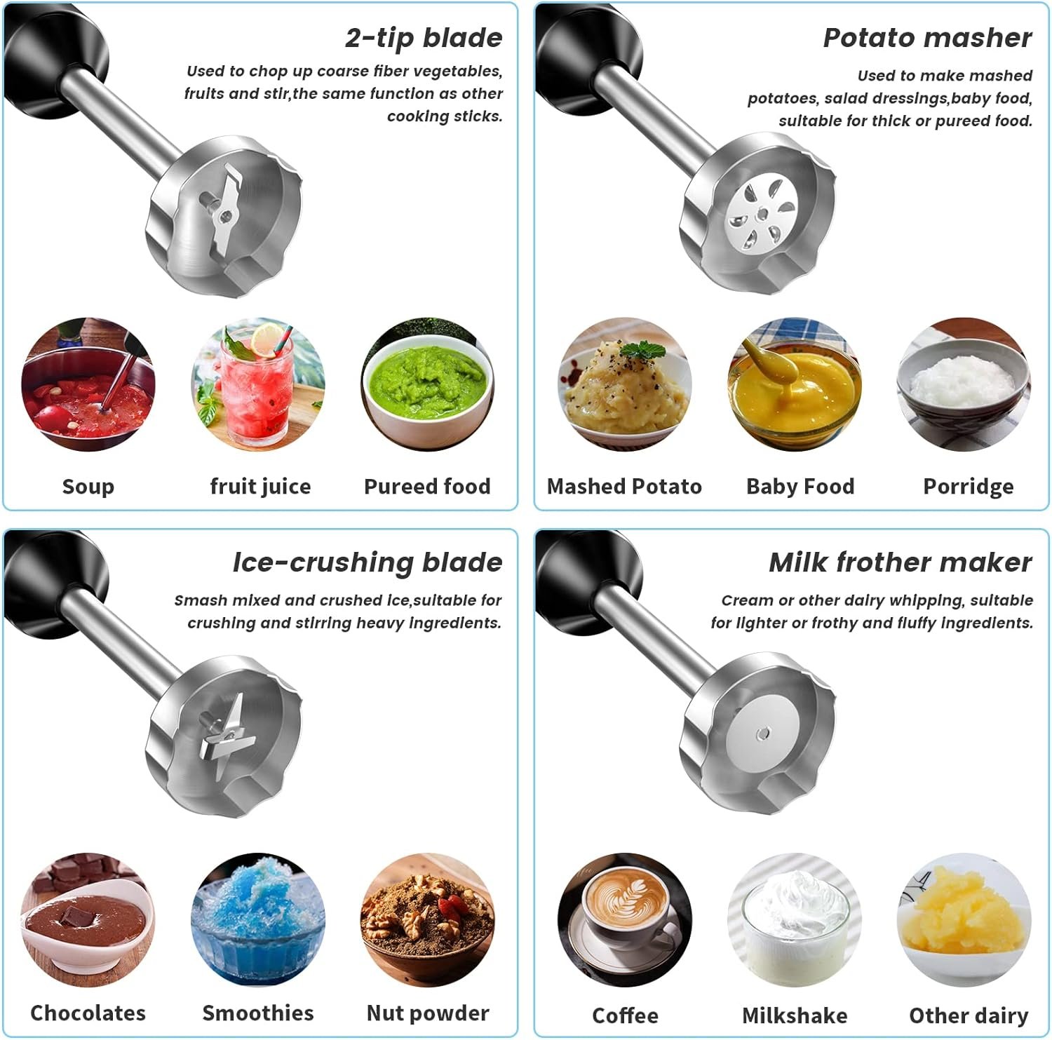 【Interchangeable Blades Design】:Our immersion blender comes with 5 interchangeable blades that perform different functions, replacing the need for multiple specialized devices like a smoothie maker, baby food maker, soup maker, food processor, hand blender, juicer, and milk frother. Pairing different ingredients with specific blades allows for perfect cuisine, unlocking endless possibilities for creative cooking.