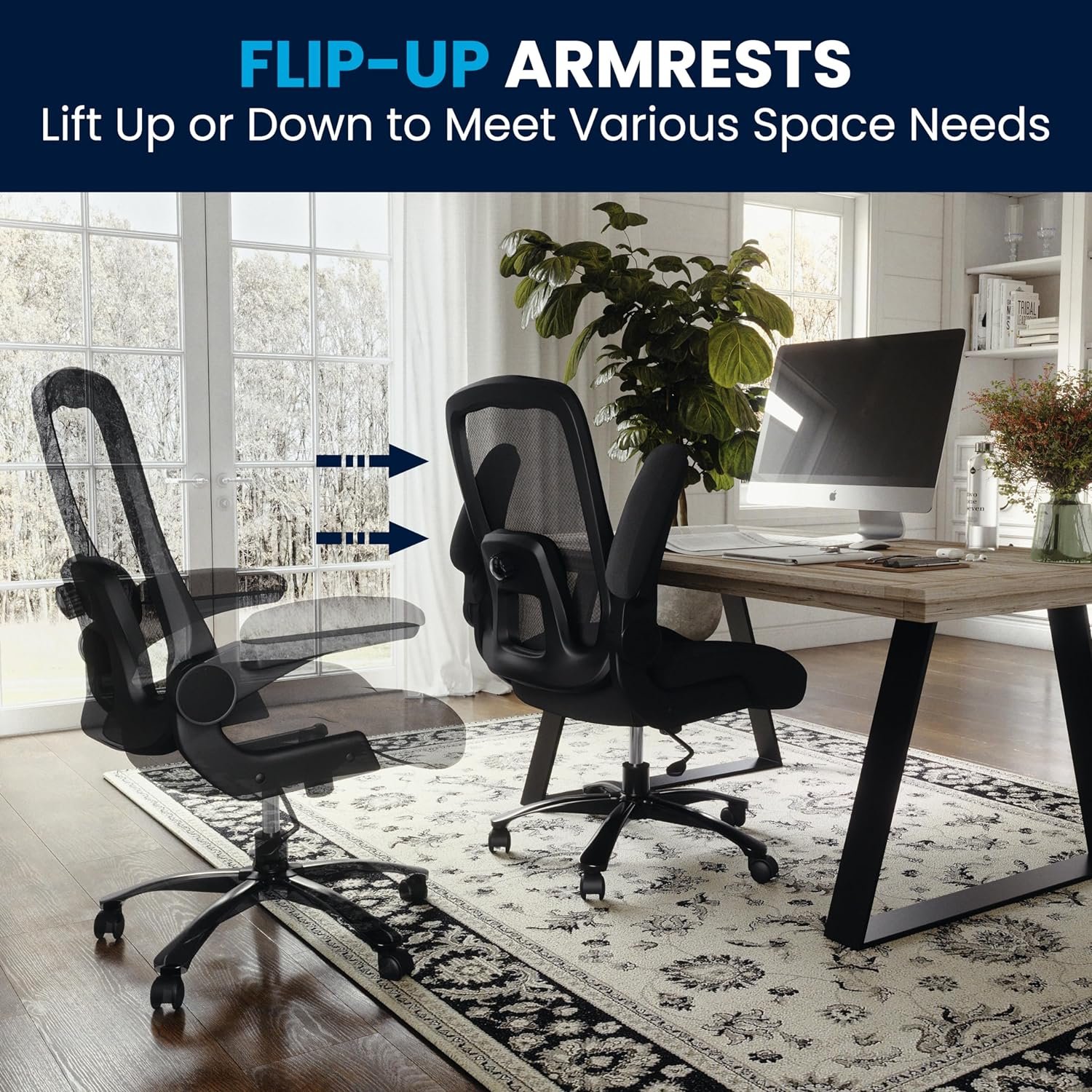 FLIP-UP ARMRESTS AND CASTERS: Flip-up arms relieve tension from the neck and shoulders and are great for users who like the option of an armless chair, and the heavy-duty metal base with dual caster wheels enables easy movement