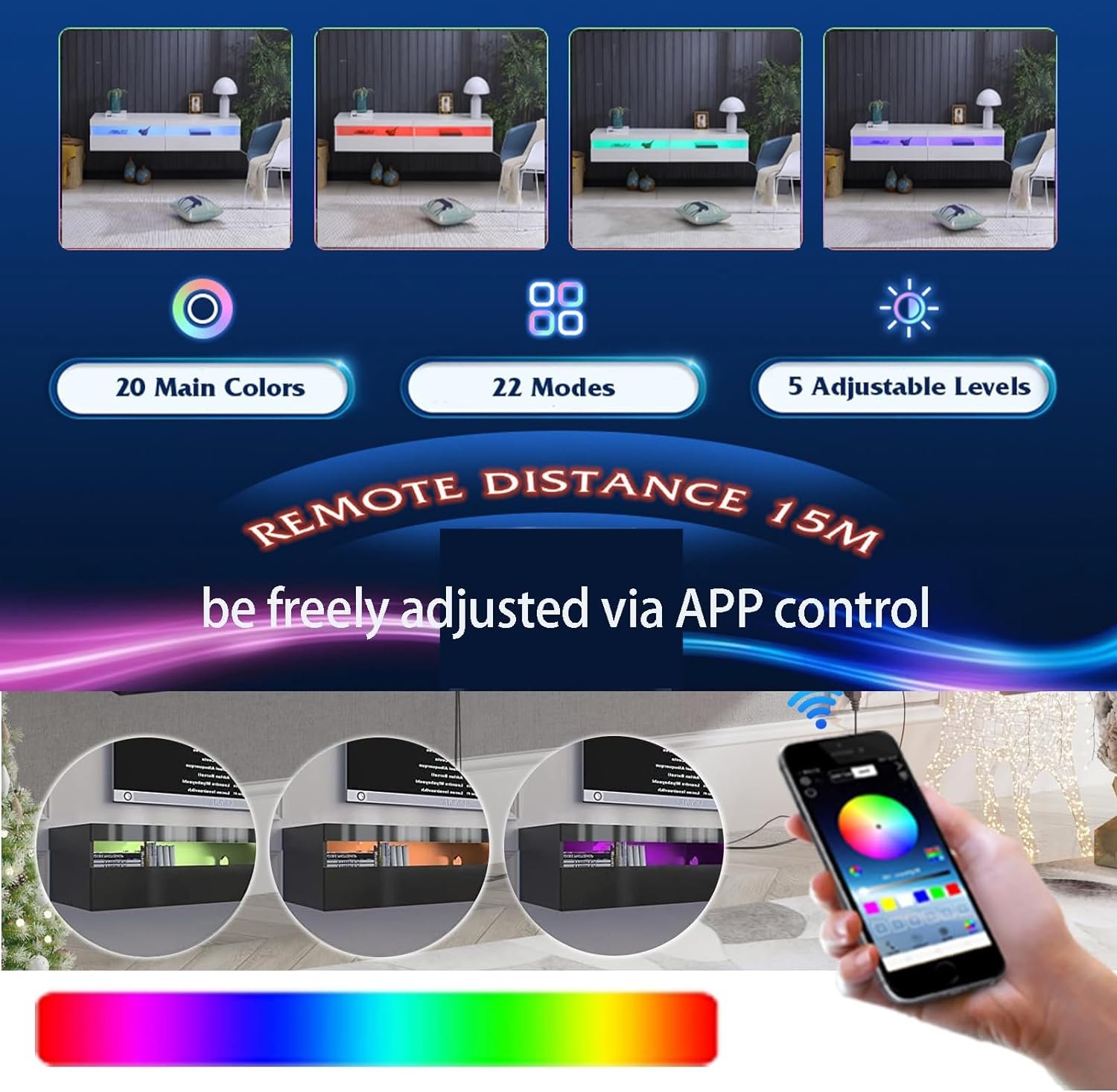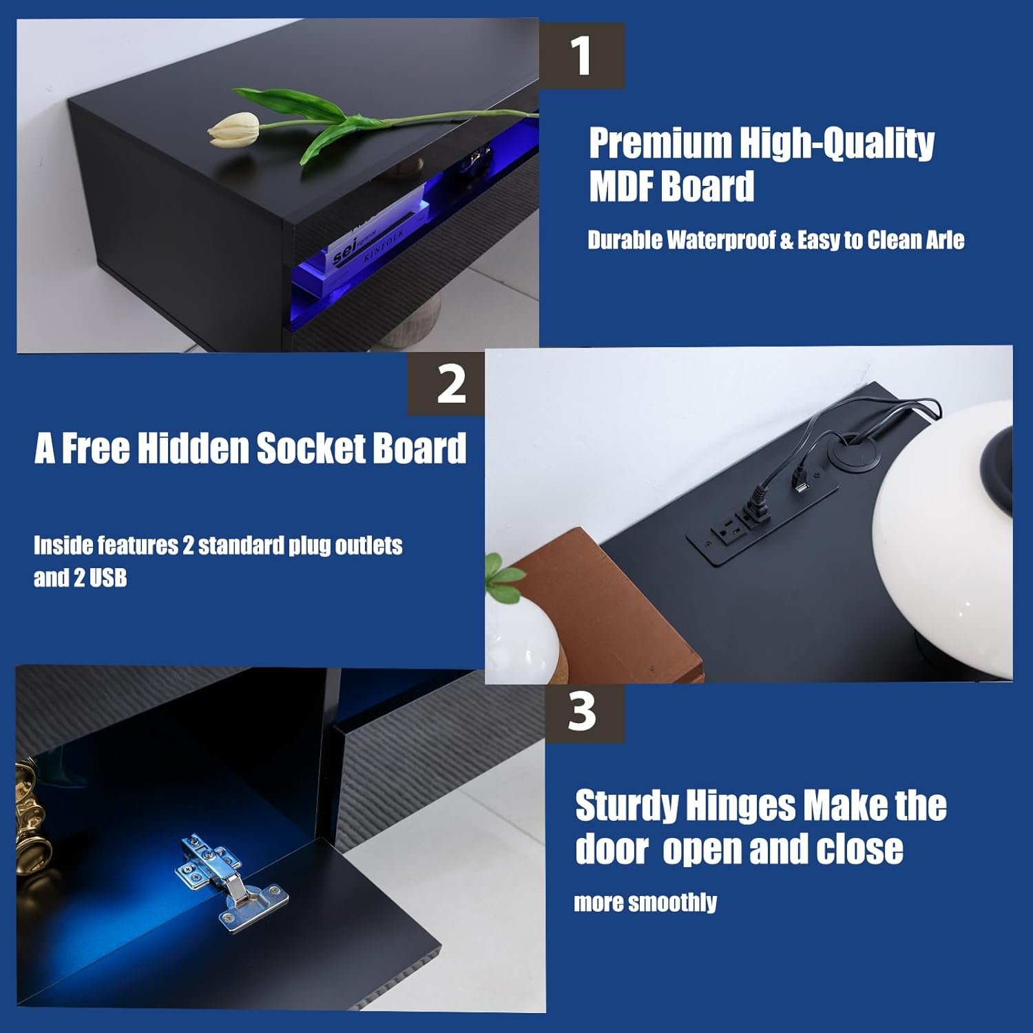 【Multifunctional Large Storage Space】– The LED TV floating stand has 2 large storage spaces, providing ample storage space for your CDs, DVDs, even books and magazines, etc., which can help you store your home neatly in the cabinet clean.