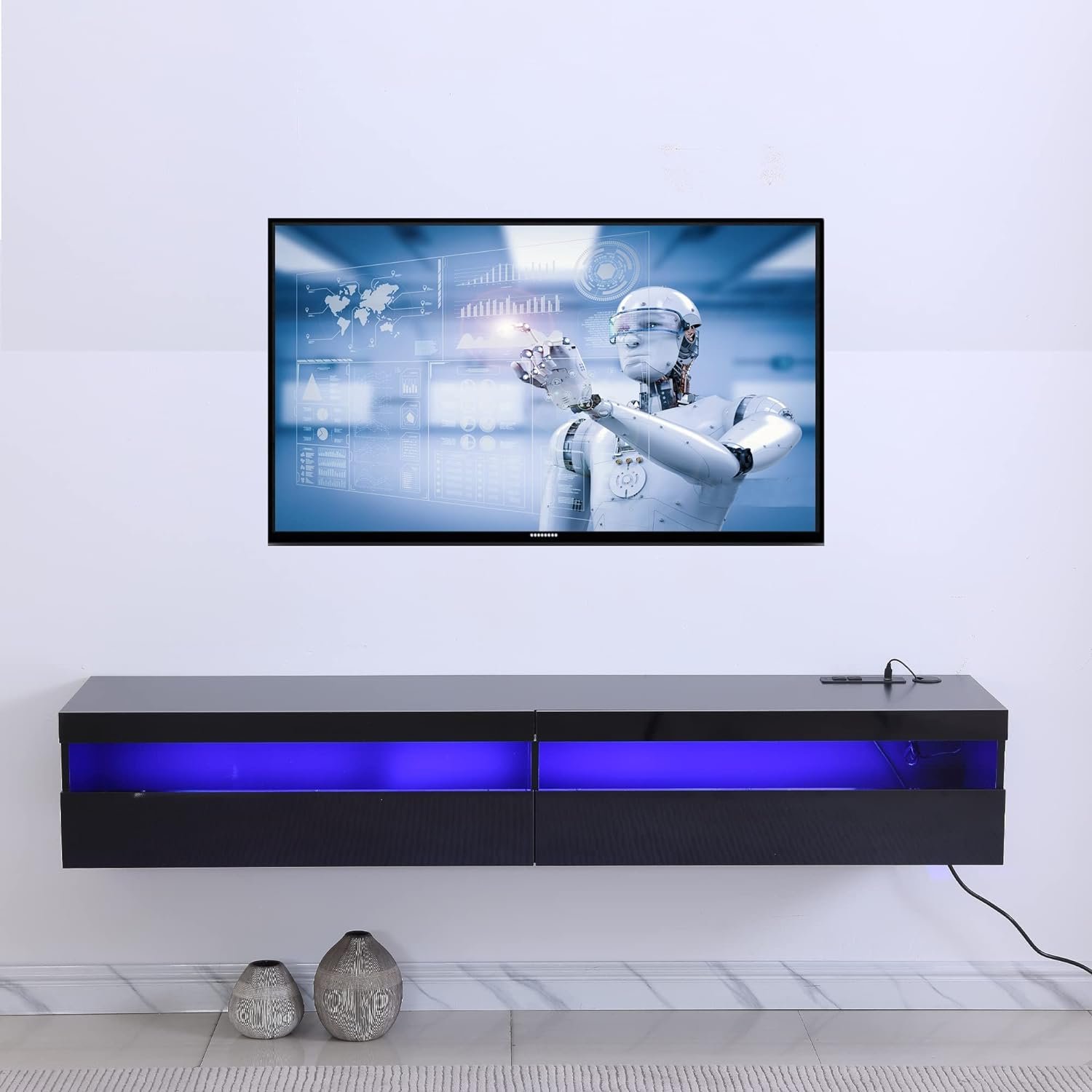 【UPGRADED POWER OUTLETS】The size of our floating entertainment console is 71″L x 16″ W x 12″H, we recommend 60″, 65″, 70″, and 75″ wall mounted media, Our TV Stand with a free hidden socket board! Inside features 2 standard plug outlets and 2 USB plugs for which you can charge your TV, DVD, WiFi router and etc, TV cabinet there is multiplecable organizer to hide your wires, easy wiring, and convenient for customers to use electronic devices.