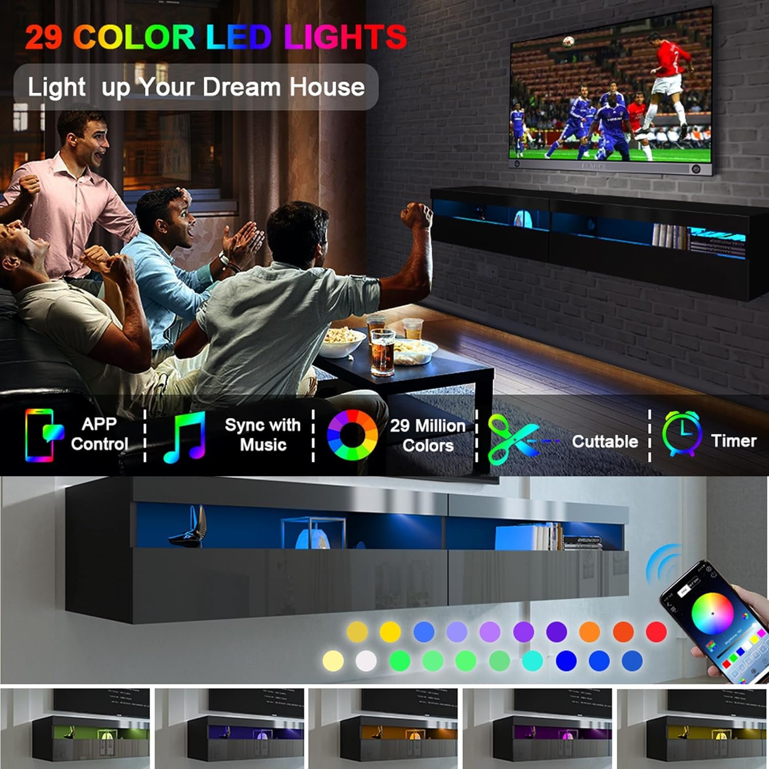 【Product Specifications】floating entertainment console is 71″L x 16″ W x 12″H, we recommend it to 60 inches, 65 inches, 70inch, 75in TV setWe do not provide installation services. Our goal is to provide the best customer service, so if you have any questions, please contact us via “Contact Seller”.