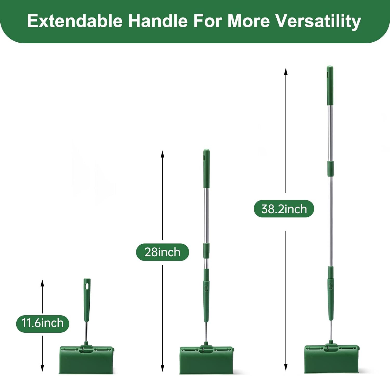 FEDICELLY FLOOR LINT ROLLER WITH EXTENDABLE HANDLE: Giant lint roller comes with extendable handle from 18.3-28.7 inch long for far reach. This retractable long handle can be adjusted to any suitable sizes as you need. You can use sticky floor roller standing up to clean hair from floor carpets, or you can easily reach under the sofa or bed to clean any dog & cat hair, dust, dirt.