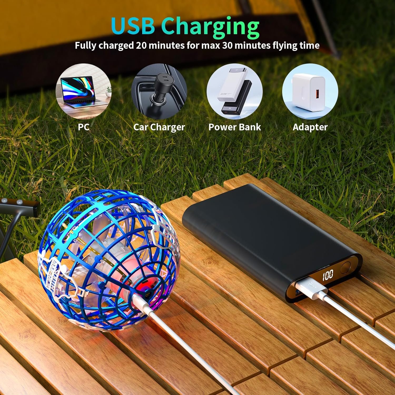 USB Charging: Our floating ball comes with a USB charging cable that can fully charge it in approximately 20 minutes. It supports 30 minutes of non-continuous operation or 8-10 minutes of continuous flight. You can charge it using various options like a computer, phone, power adapter, or portable charger. The charging indicator lights up during charging and automatically turns off when fully charged.