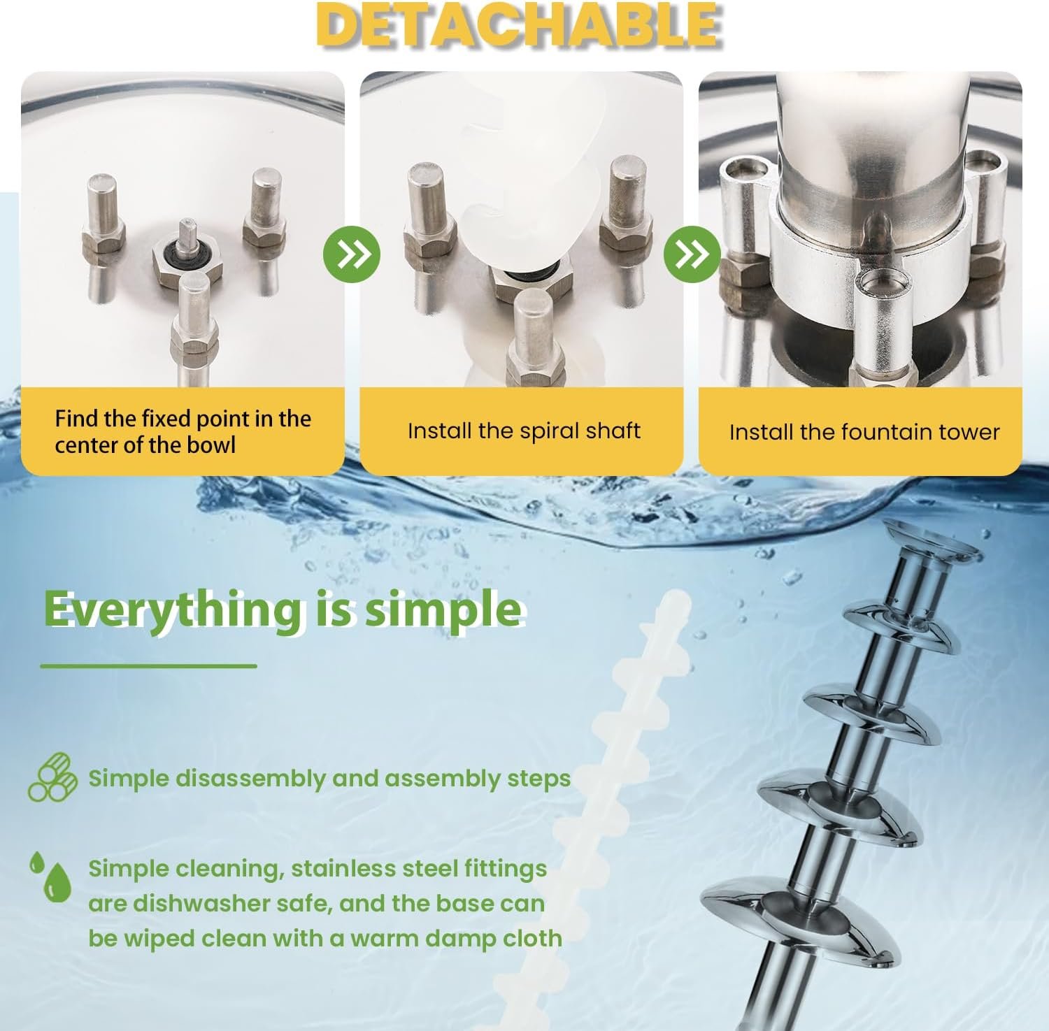 Heavy Duty&durable: The whole machine is made of thickened stainless steel and heavy-duty steel, which is sturdy and durable. 230W high-power pure copper motor provides strong power and does not produce much noise during use. In addition, the formed fountain is continuous, stable, delicate and smooth. The multiple cooling holes at the bottom and side of the machine, can dissipate heat better and prolong the service life of the machine while continuing to work.