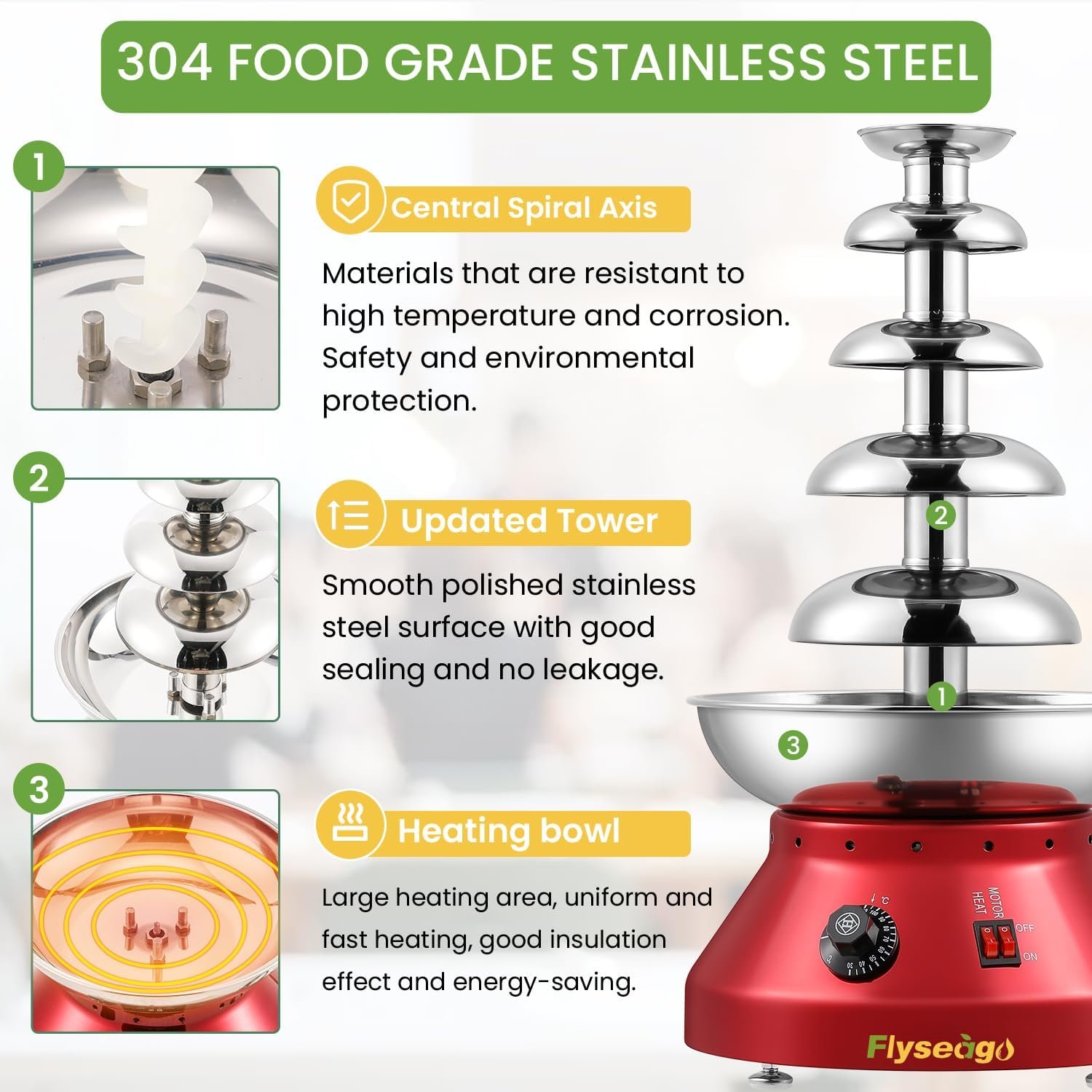 Easy to Clean&hassle-Free Buying: Detachable design for easier cleaning, stainless steel fittings, are dishwasher safe. Flyseago’s chocolate fountain has CE certification and quality assurance. We also provide free lifetime after-sales service and one-year return and change service, so that you can buy without worry.