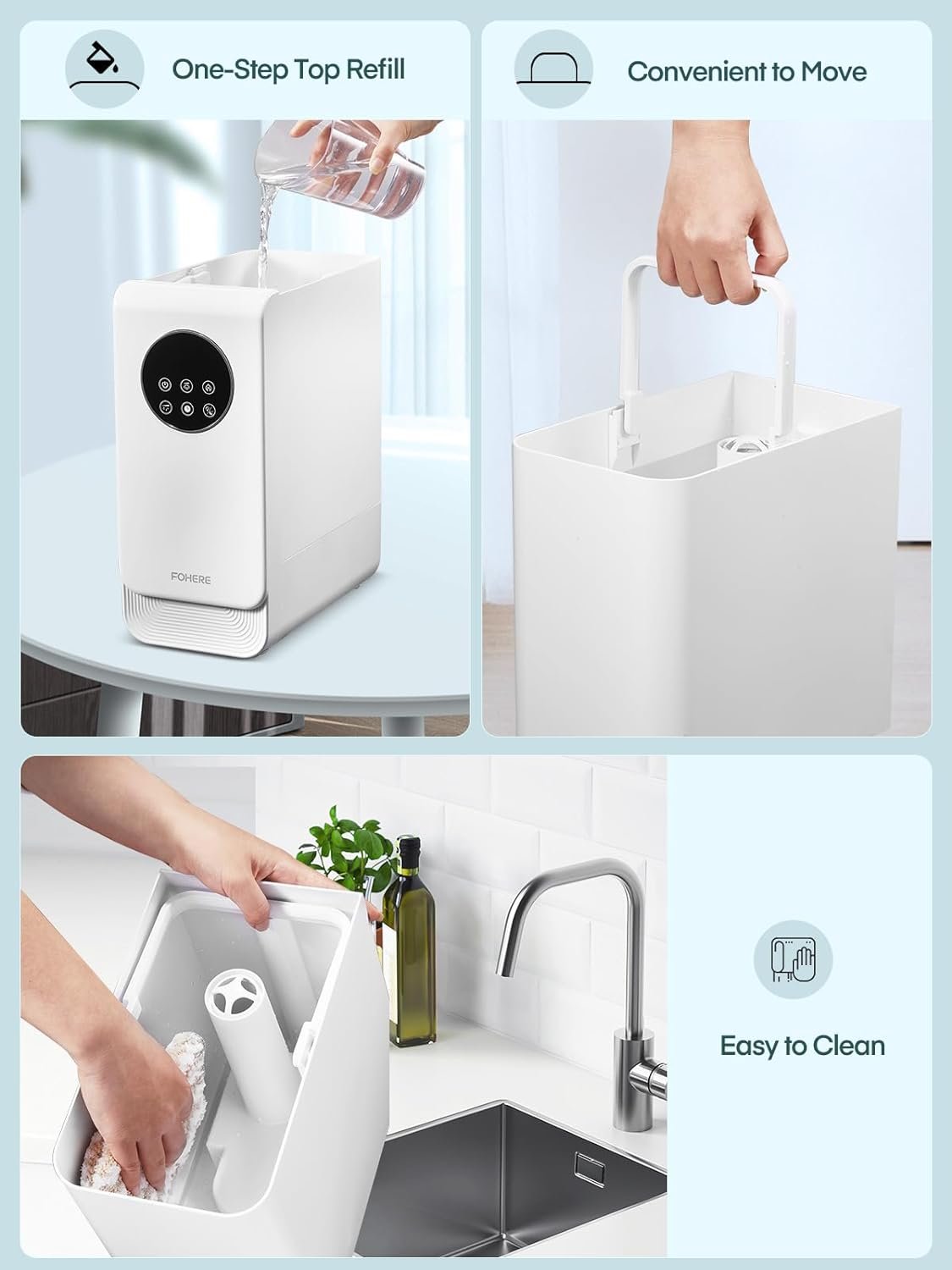 🌈【Easy to Refill and Clean with Top Fill】Say goodbye to upside-down water tank filling. Our large top-fill tank design ensures easy refills and cleaning. The built-in handle makes it very convenient to carry water.