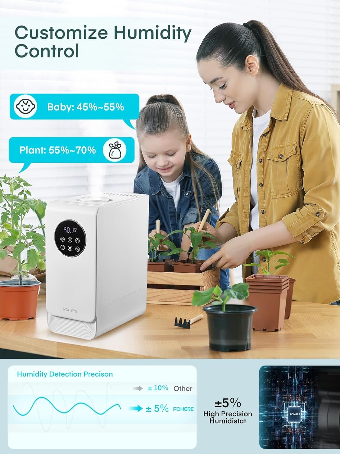 🌈【Customize Humidity Control, Ideal for Home Use】This air humidifier has a humidity adjustment function that can be adjusted from 30%-80%, giving all-around care to your baby and plants. With a built-in sensor, the constant humidity mode maintains a healthy humidity level within ±5% in your room.