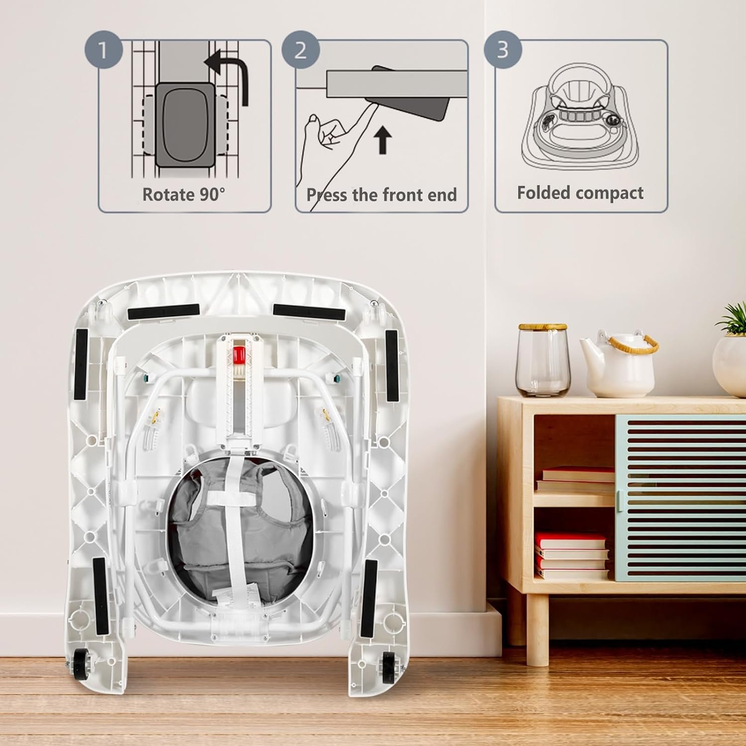πŸ‘ΆπŸ»[Foldable Design Save Space]: Our portable walker for baby have folding support arms, which is easier to transport or store when not in use. Rotate the red button half a turn and make sure it aligns with the gap, then press the front end of the red button to easily fold. You can slide it under the bed or sofa for storage, and even if place the baby activity walker against the wall, it will not take up too much space.