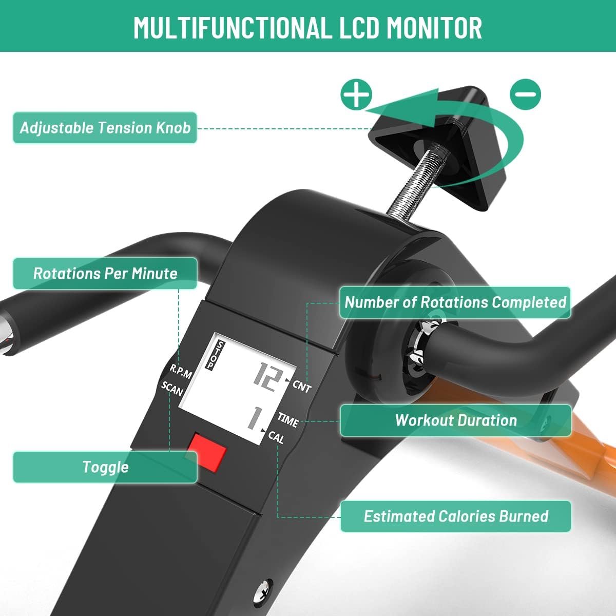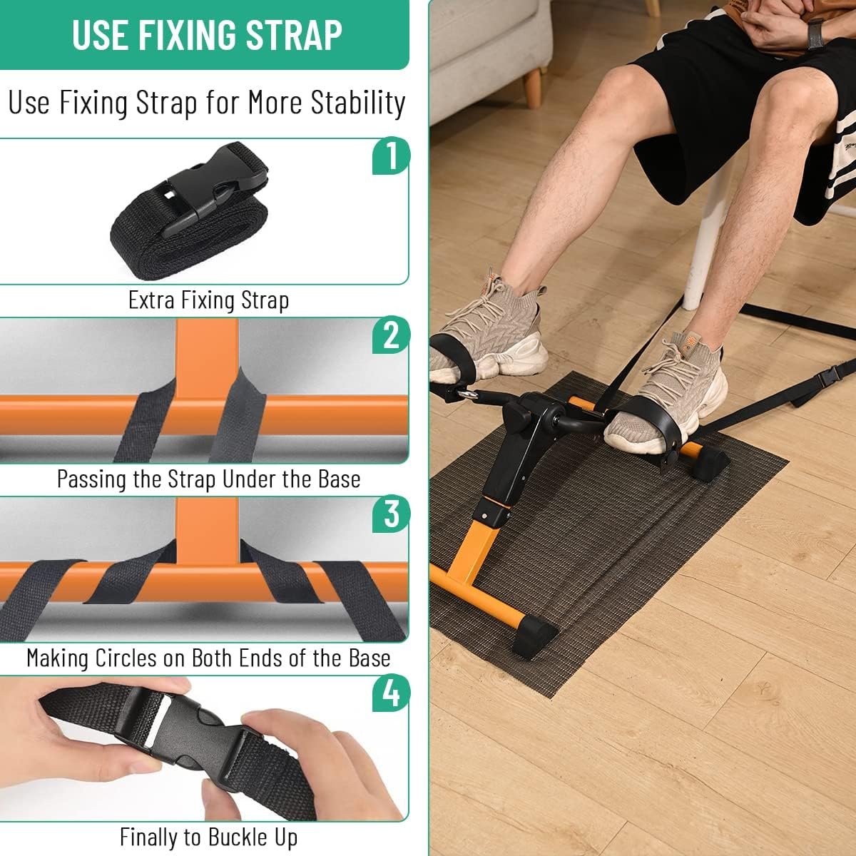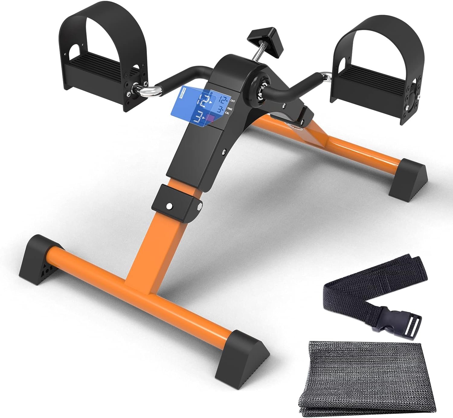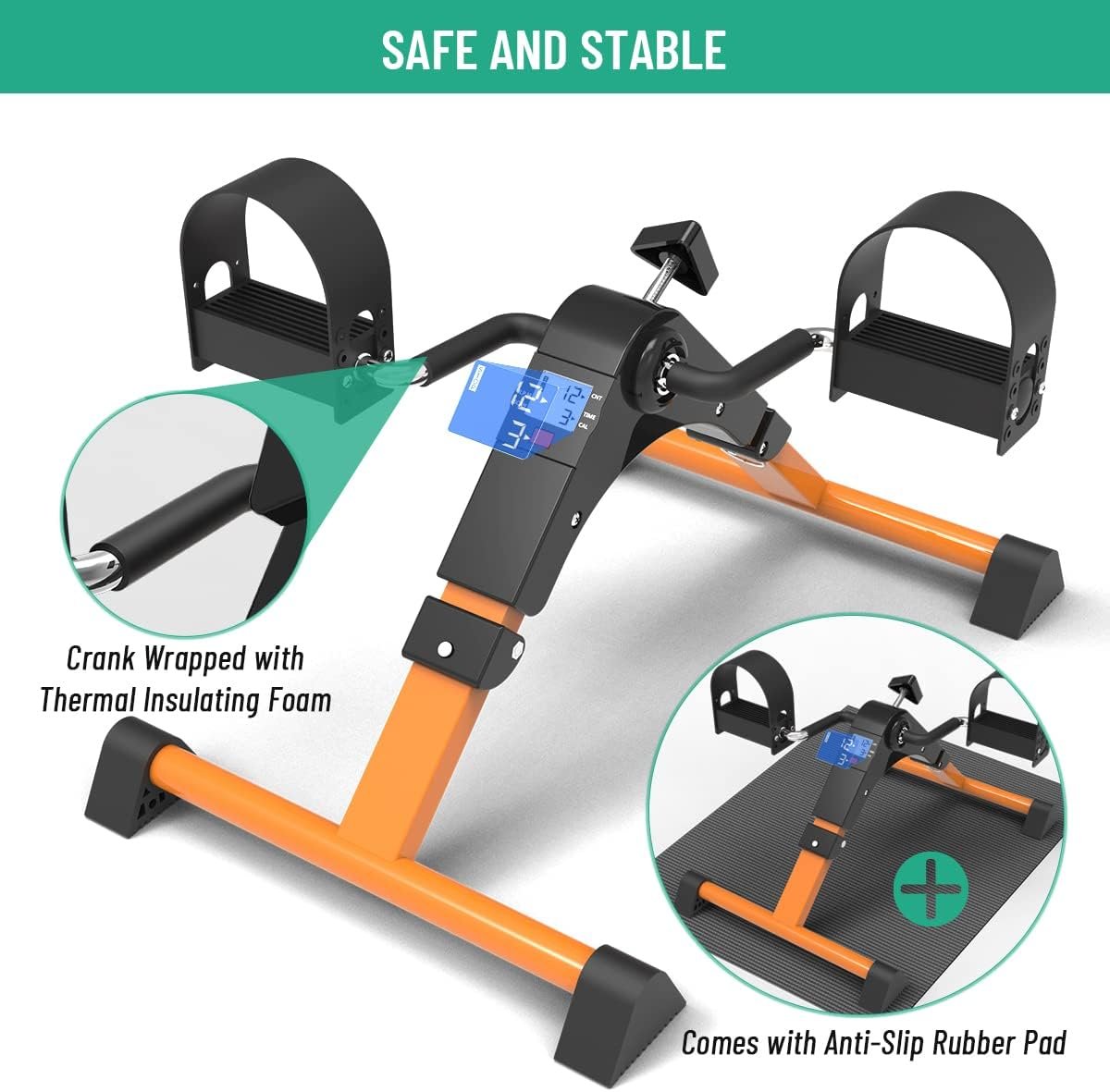 SAFE STABLE: The peddler exerciser is made of reinforced steel pipe, and the crank is wrapped with heat-insulating foam, which is safe and stable to use, sturdy and durable. The non-slip rubber pads work with the non-slip mat to keep the stationary pedal exerciser in place even at maximum resistance levels without scratching the floor. The non-slip surface of the ergonomic pedal increases friction and safety. Adjustable four-hole foot straps can be flexibly adapted to feet of different sizes.