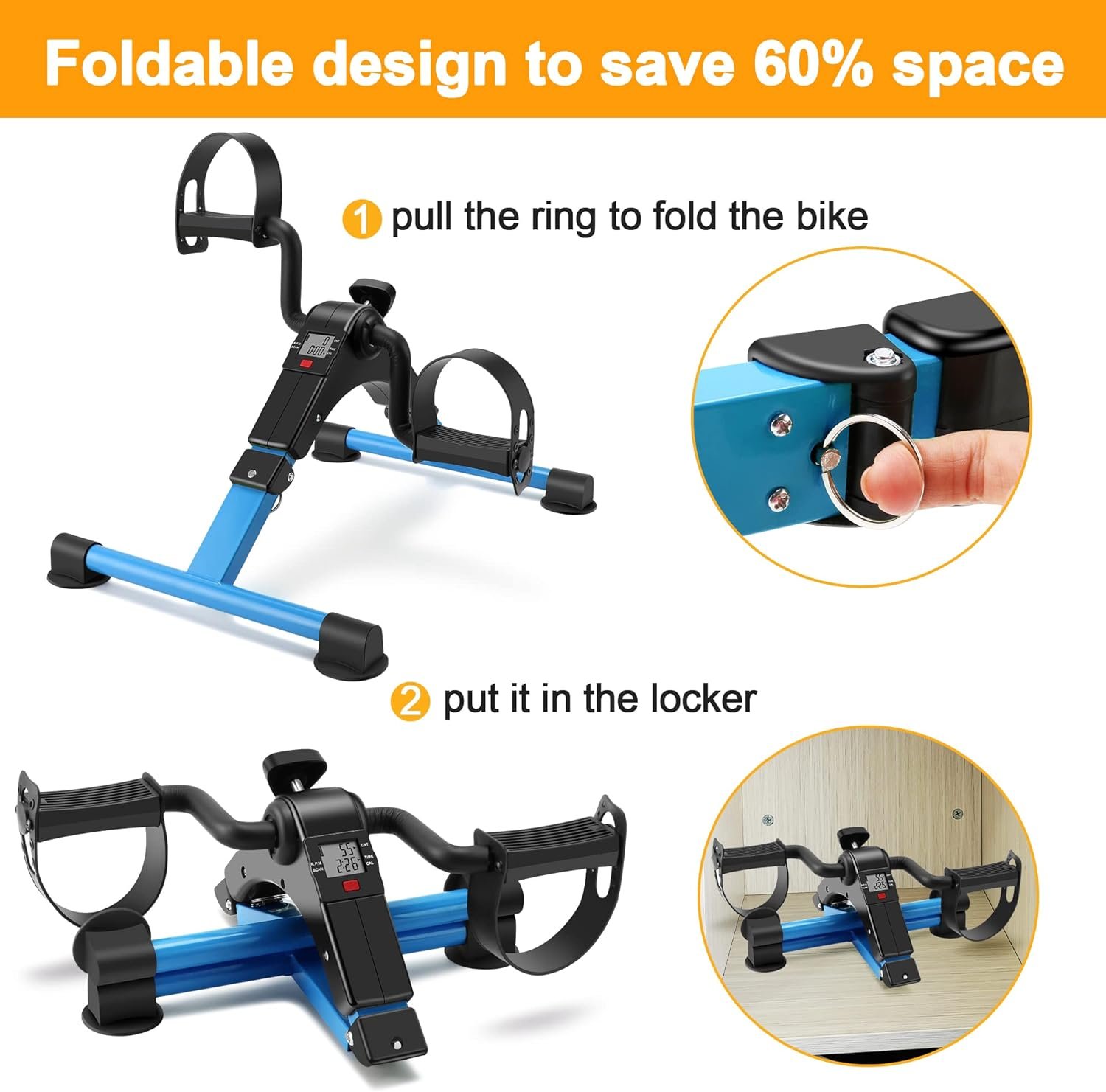 Quick-Fold Mechanism -This foldable exercise bike can fold and unfold quickly,Compact, lightweight, easy to store or bring on the go.