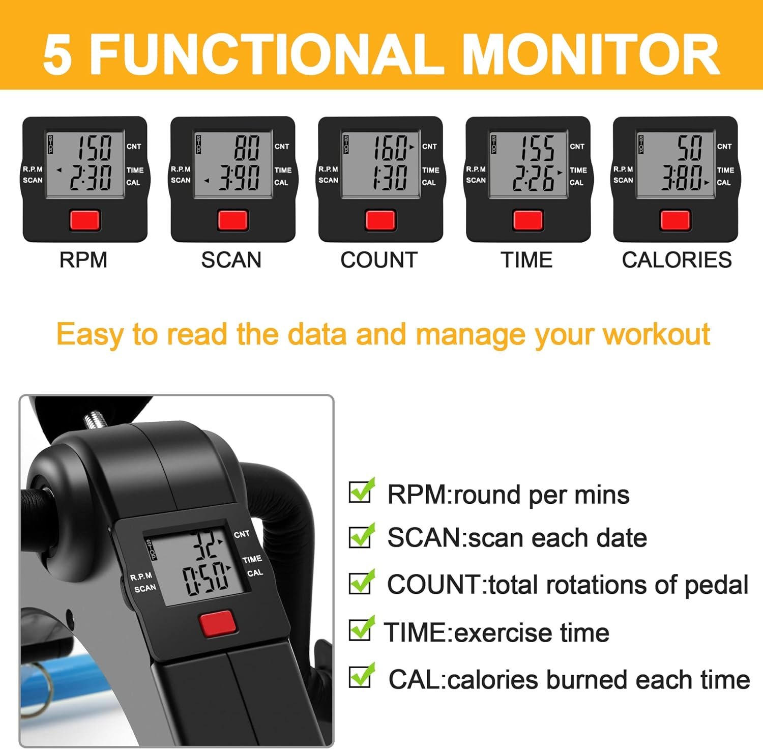 LCD Monitor- The LCD monitor displays exercise TIME, COUNT, RPM ,CALORES and SCAN, very easily to arrange your exercise.