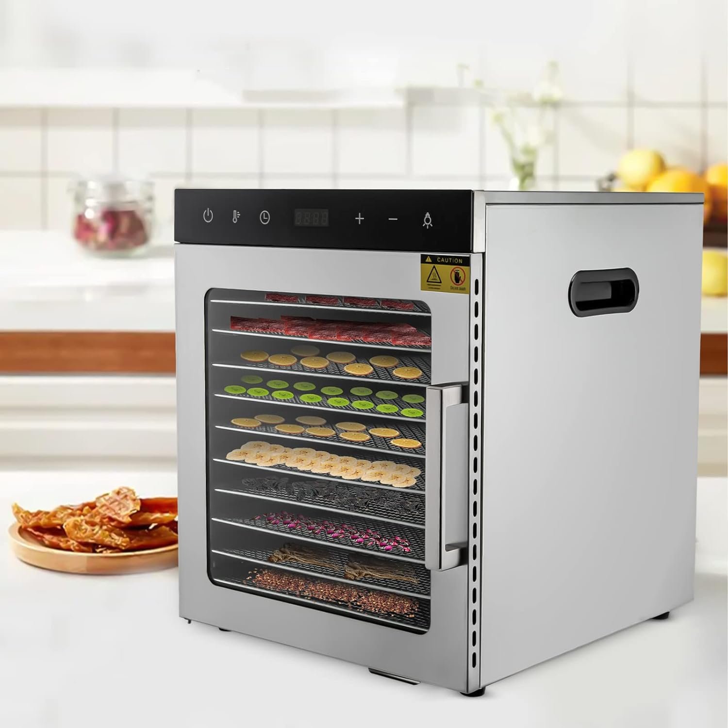 [Large Capacity] The food dehydrator has 10 trays, each with a size of 11.81×11.02inch, so it has excellent expansion space allowing you to dry multiple foods at once.