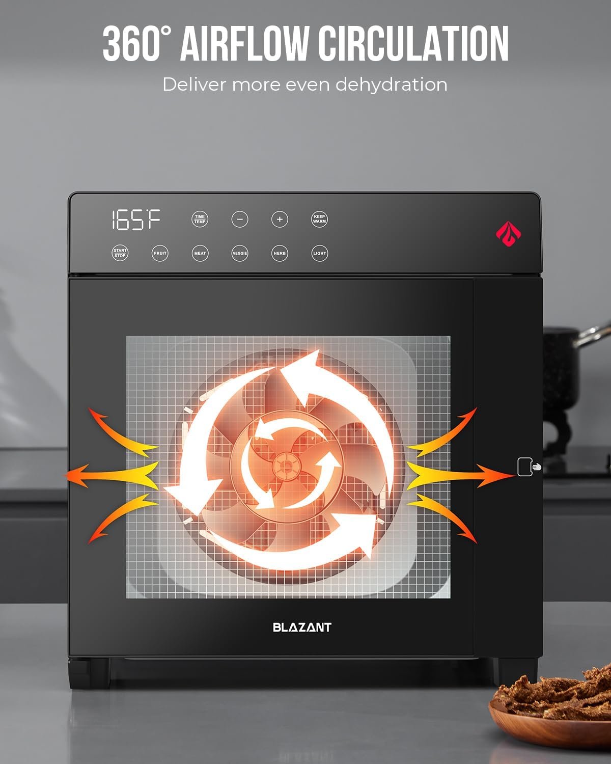 🍋【360° Airflow Circulation Technology】Equipped with a powerful fan, this dehydrator ensures even heat distribution across all layers, mimicking natural drying processes. This means your food will dry uniformly and quickly, preserving essential nutrients and the original flavors.