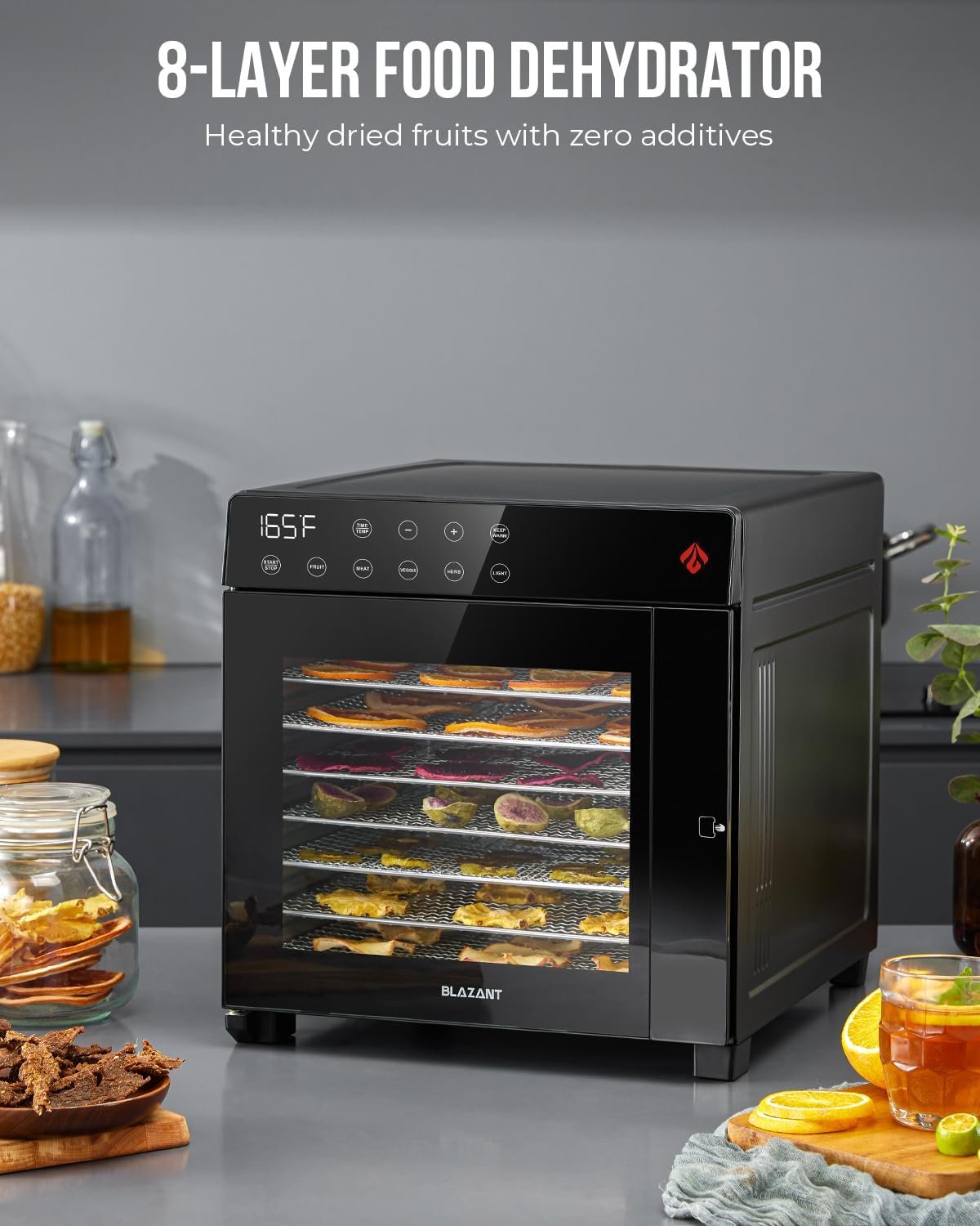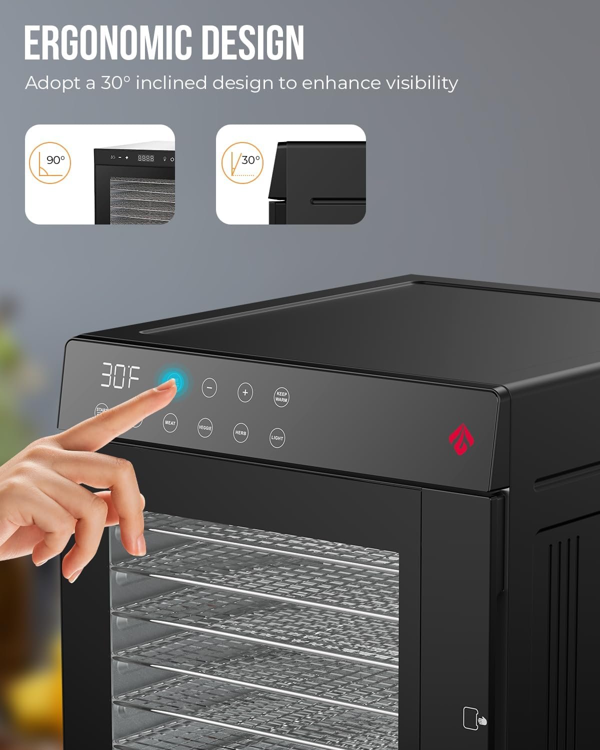 🥝【User-Friendly Design】Featuring a 30° angled LED display screen and intuitive touch control buttons, our dehydrator offers optimal visibility and ease of use.