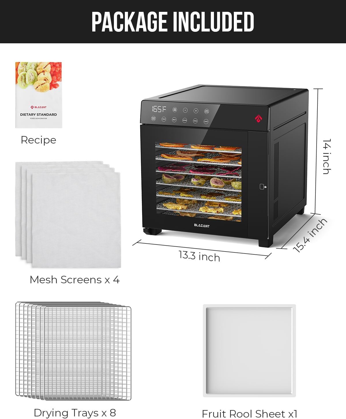 🍍【What’s Included】The package contains 1 dehydrator, 8 drying trays, 4 mesh screens, 1 fruit roll sheet, 1 user manual, and 1 recipe book. With this fruit dehydrator, you can meet your family’s needs for a whole week in a single use. Adjustable grids allow you to customize the height to accommodate various ingredients. If you have any questions, please reach out to our professional team.