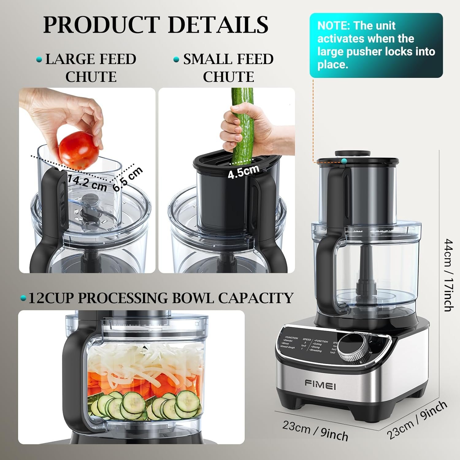 【Extra-Large Capacity and Large Feed Chute Design】Enjoy the luxury of space with food processor 12-Cup capacity,tailored to manage a wide range of culinary tasks. From preparing small batches of baby food to processing larger portions, the expansive feed chute can even accommodate a whole block of food, reducing the need for frequent reloading. Make more and reload less!