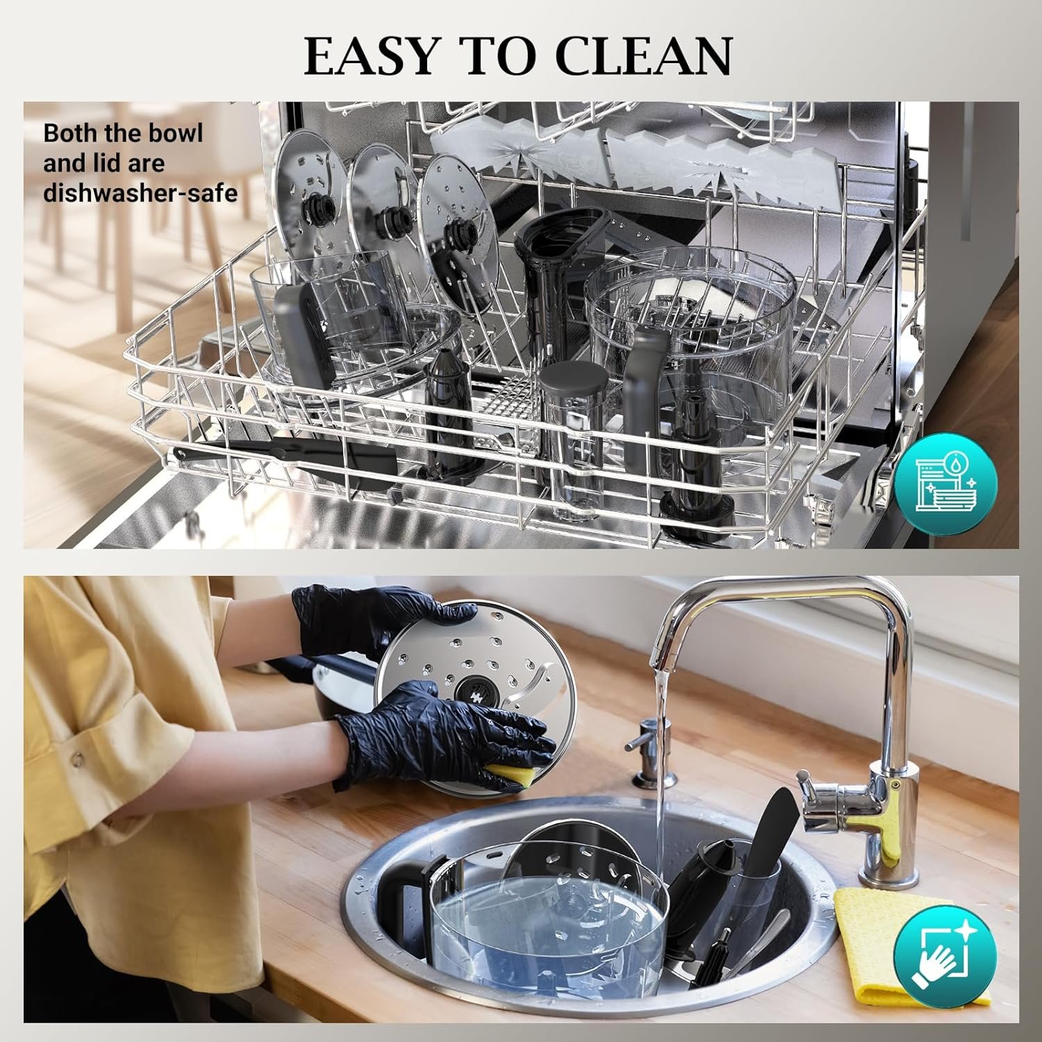 【Effortless Cleaning and Space-Efficient Design】Experience hassle-free cleaning with our user-friendly design. The detachable parts make it simple to clean the container and blades—just add warm water and a drop or two of dish soap. Food Processors all components are BPA-free and dishwasher safe. Its compact footprint ensures that it won’t hog your countertop or kitchen cabinets.