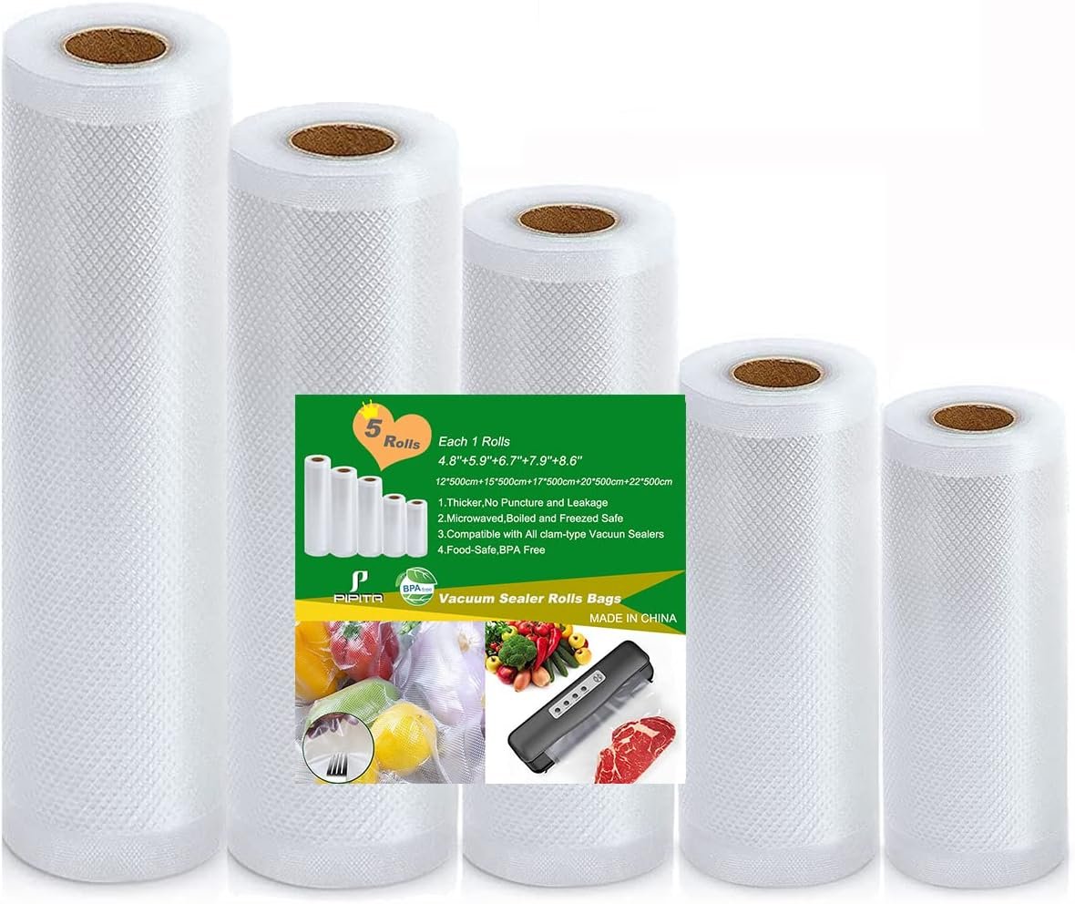 This set of 5 rolls of food vacuum bags has 5 different sizes, it is very convenient to meet different needs. These food vacuum rolls are not pre-cut which allows you to choose the size according to your needs.