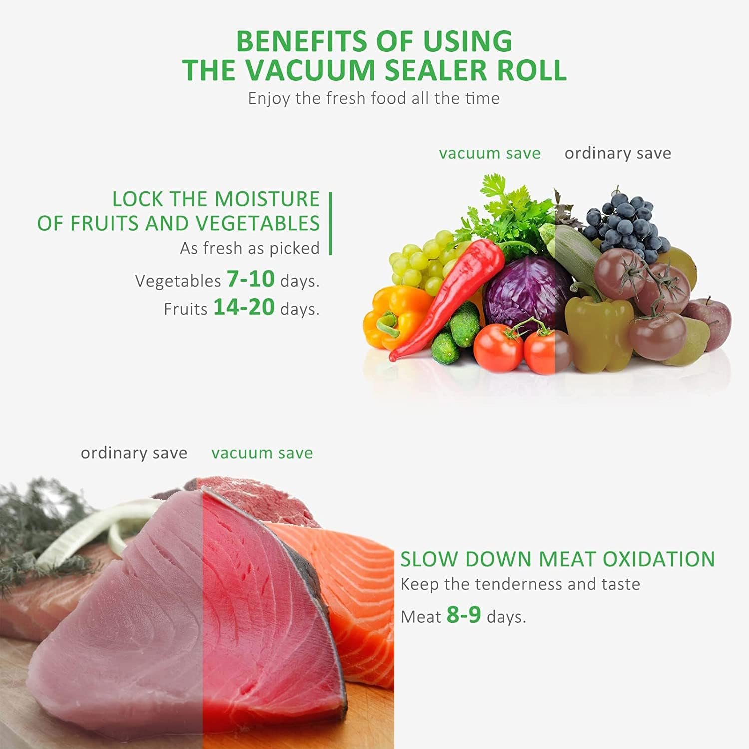 🥑Great Value: 4.8 inches * 16’ft, 5.9 inches * 16’ft, 6.7 inches * 16’ft, 7.9 inches * 16’ft, 8.6 inches * 16’ft 1 rolls each. With embossed channels to increase suction, keep fresh. Easy cut to any length you need to fit the food size, reducing material waste and saving money.