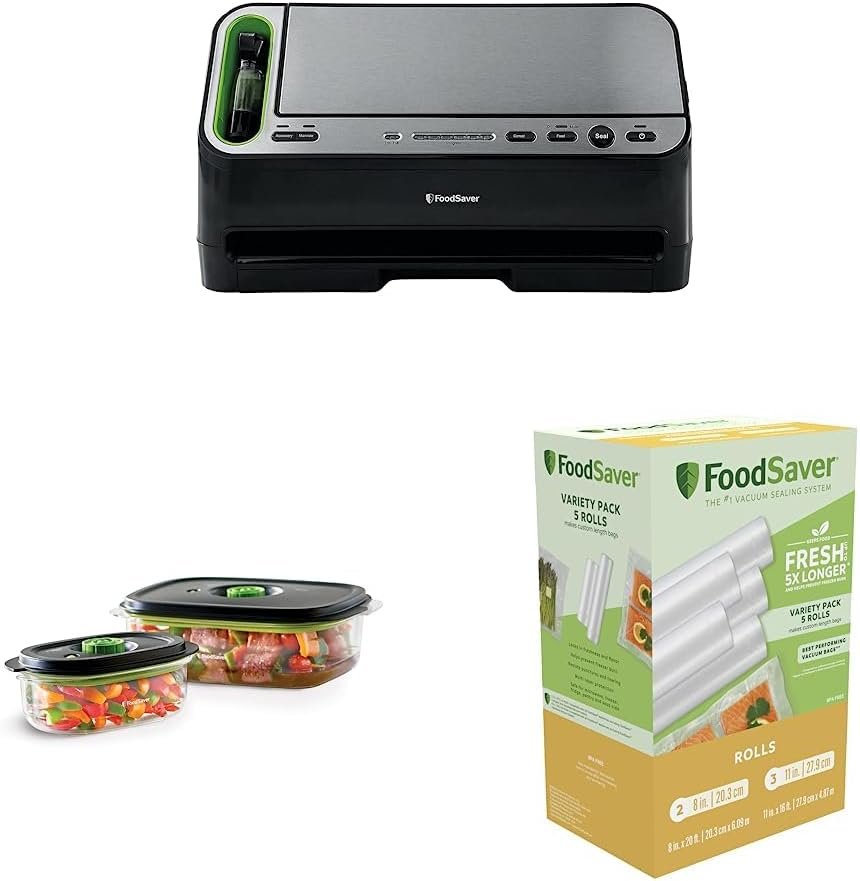 FoodSaver V4400 2-in-1 Vacuum Sealer Machine, Black and Silver & 2116382 Preserve & Marinate Vacuum, Clear (Count-2) & Vacuum Sealer Bags, 8″ (2 Pack) and 11″ (3 Pack) Multipack